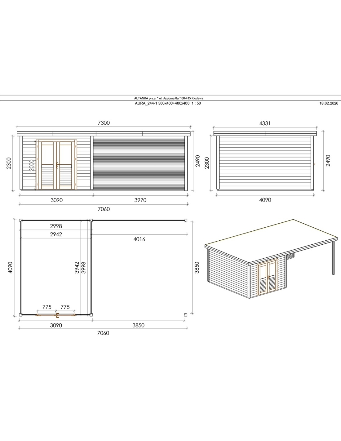* - Der Fußboden ist nicht im Preis inbegriffen. Gartenhaus aus Holz 000244 von ALTANKA p.s.a. ist idealer Ort zum Entspannen und zum Spaß für die ganze Familie. Das Haus ist aus hochwertigem Holz gefertigt. Es ist 7.06M breit und 4.09M tief, was viel Platz innen bietet.