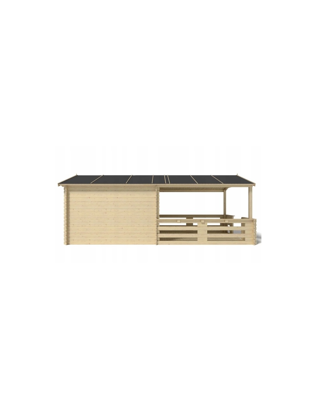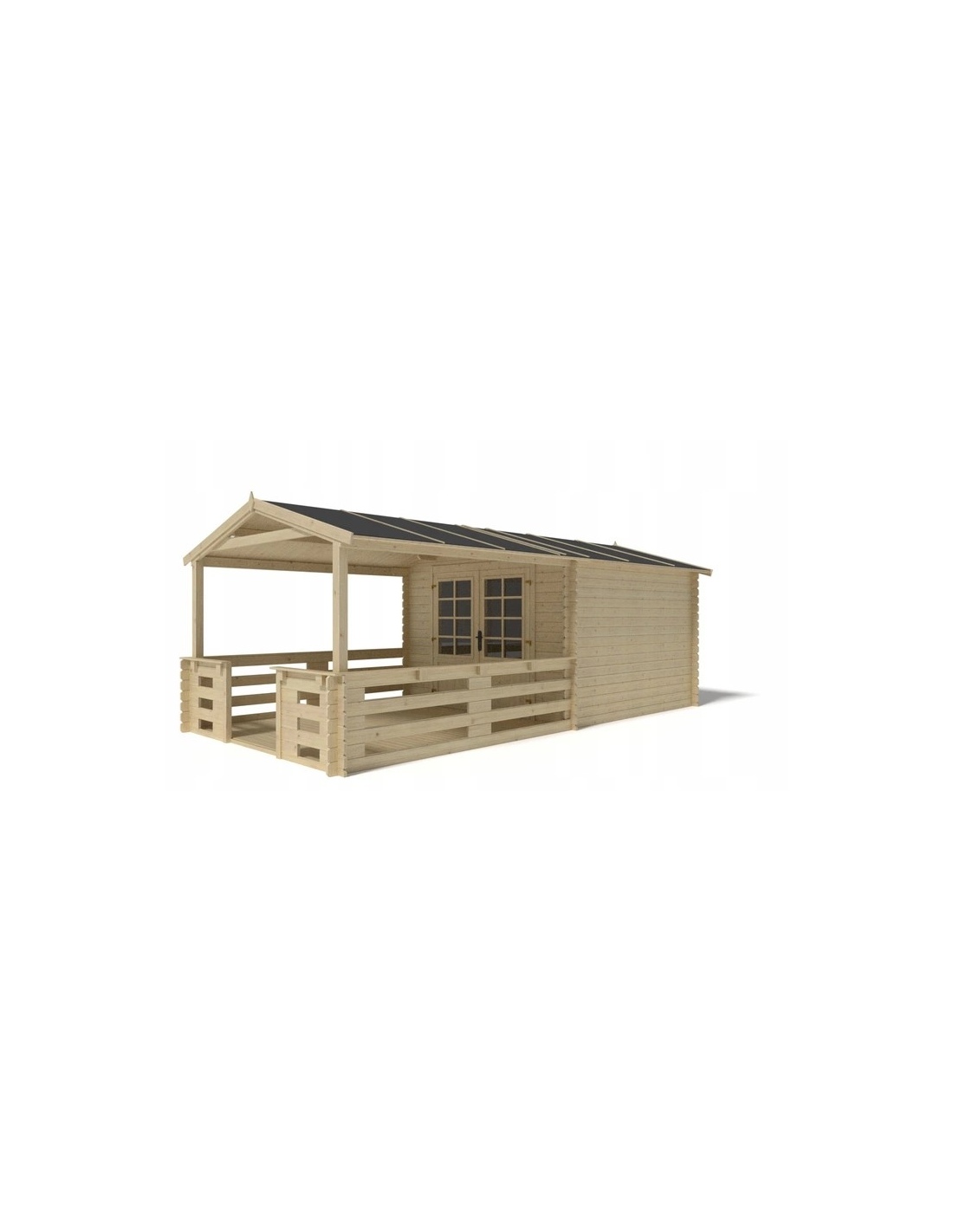 Gartenhaus DOM530+DOM394+DOM395+POD04 im Set mit Veranda und Dach Blockholenkonstruktion, Farbe Holz, zur Selbstmontage.