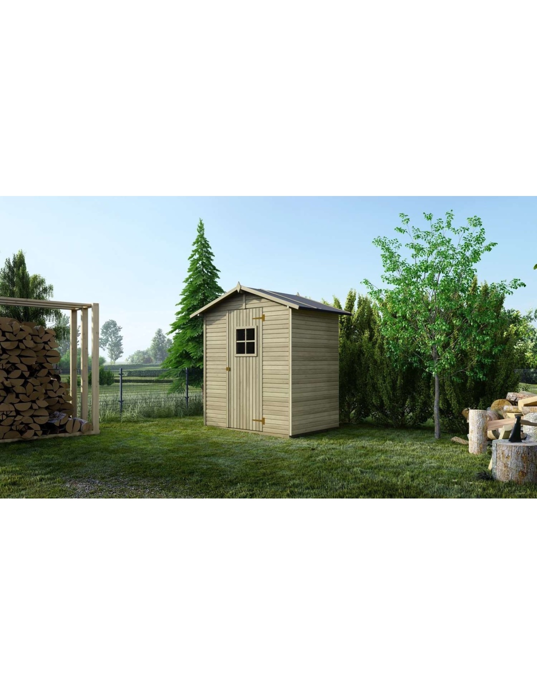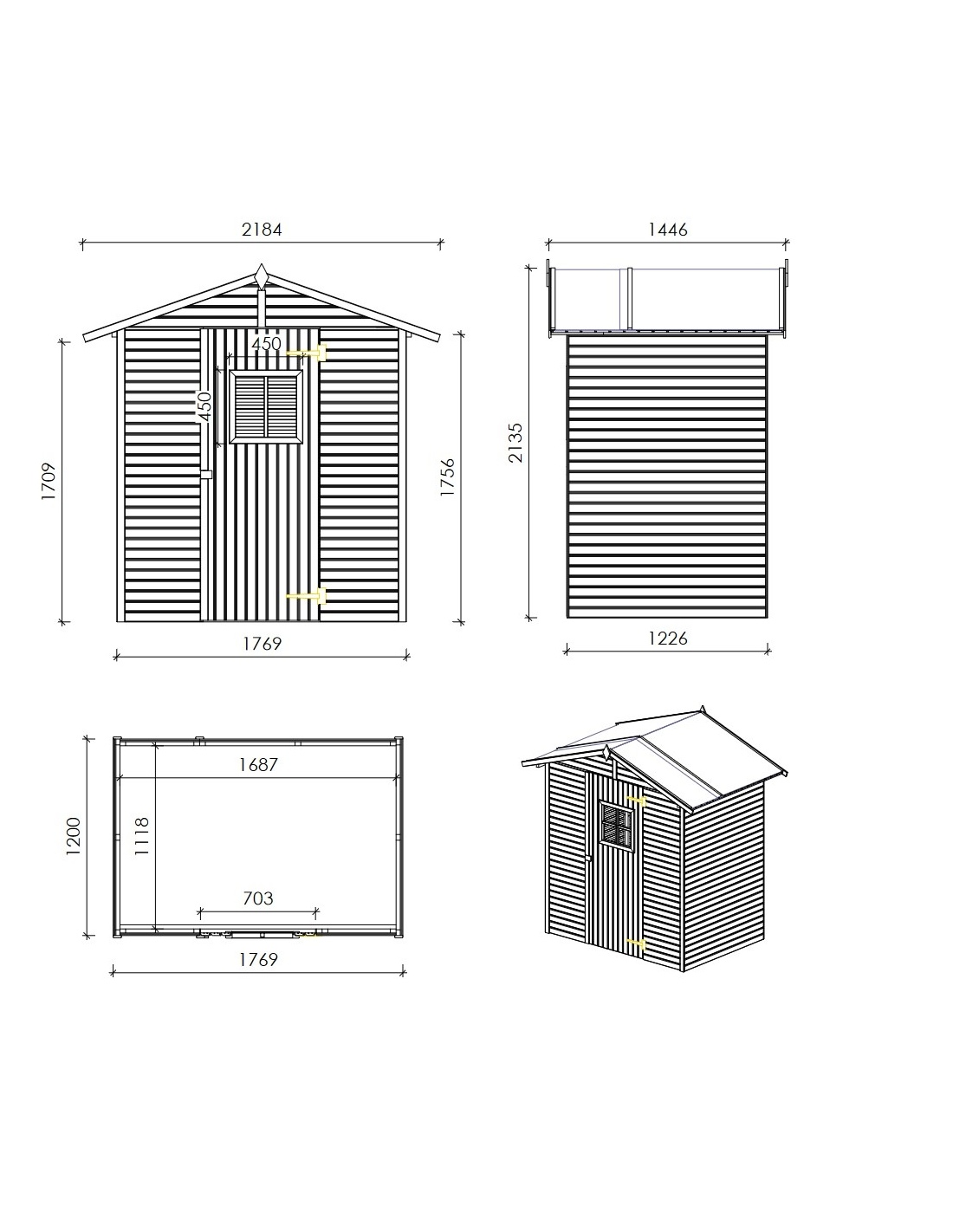 Werkzeugschuppen aus Holz DOM132 mit einer Fläche von 2.17 m2, einer Frontbreite von 1.77 m, einer Tiefe von 1.23 m und einer Wandstärke von 16 mm. Die Montage des Schuppens mit der im Produkt enthaltenen Anleitung ist unkompliziert.
