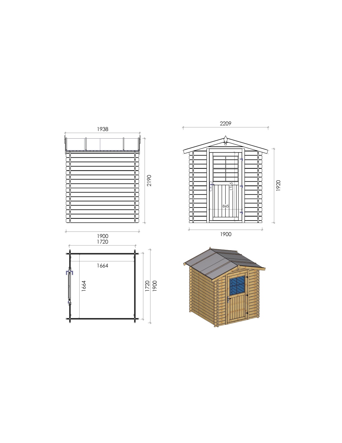 Gartenhaus aus Holz DOM593 von ALTANKA p.s.a. Es ist aus hochwertigem Holz gefertigt. Es ist 1.9M breit und 1.9M tief.