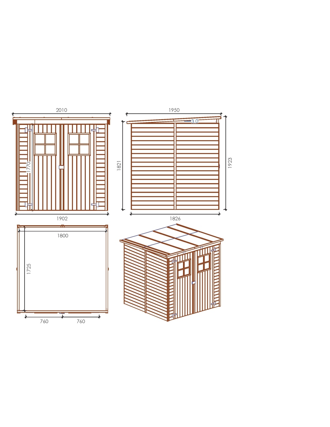 Werkzeugschuppen aus Holz DOM10 mit einer Fläche von 3.42 m2, einer Frontbreite von 1.9 m, einer Tiefe von 1.8 m und einer Wandstärke von 12.5 mm. Die Montage des Schuppens mit der im Produkt enthaltenen Anleitung ist unkompliziert.