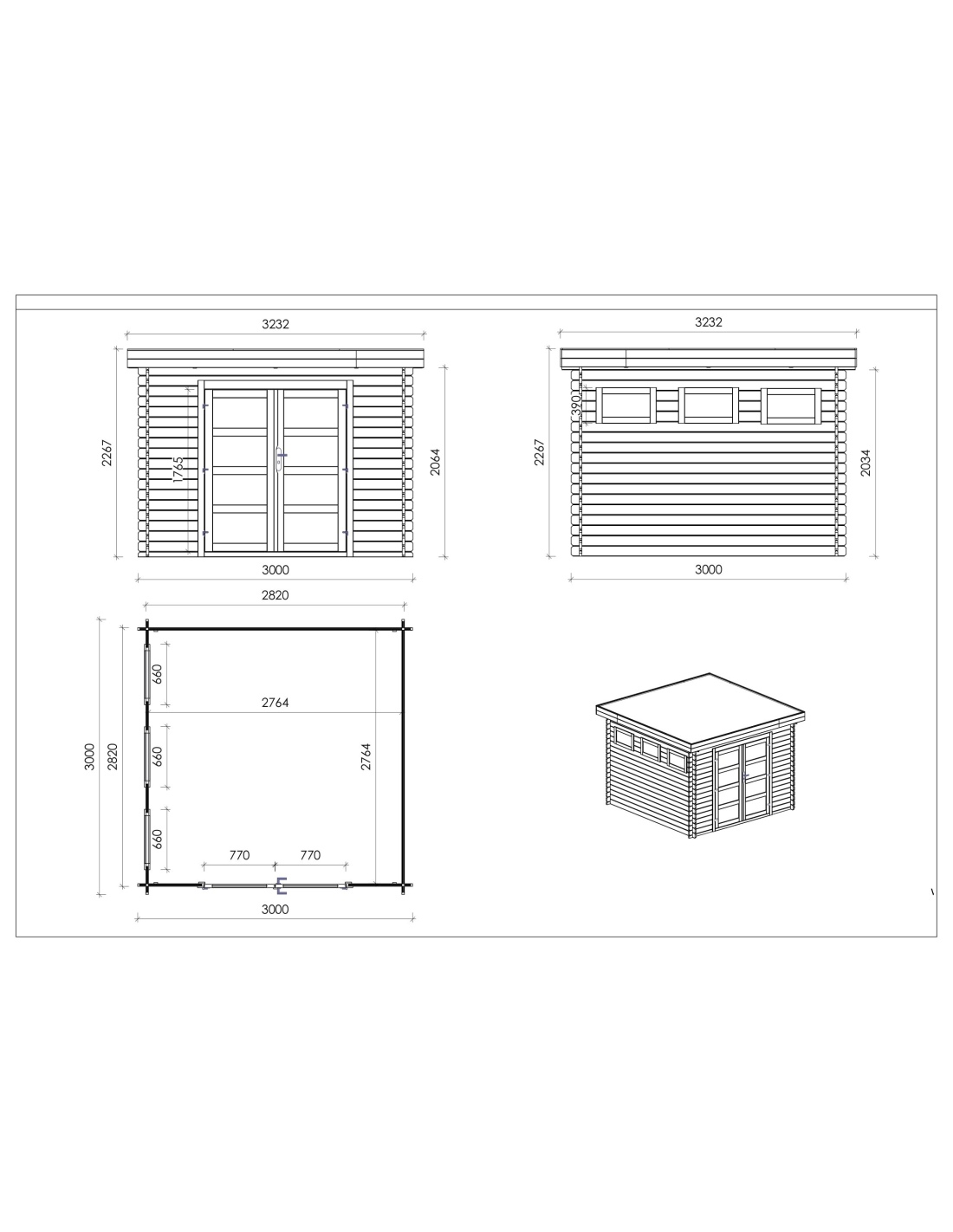 Die Fotos zeigen das Holzhaus DOM629 mit der Fläche von 9 m2, Frontbreite von 3M und Tiefe von 3M.