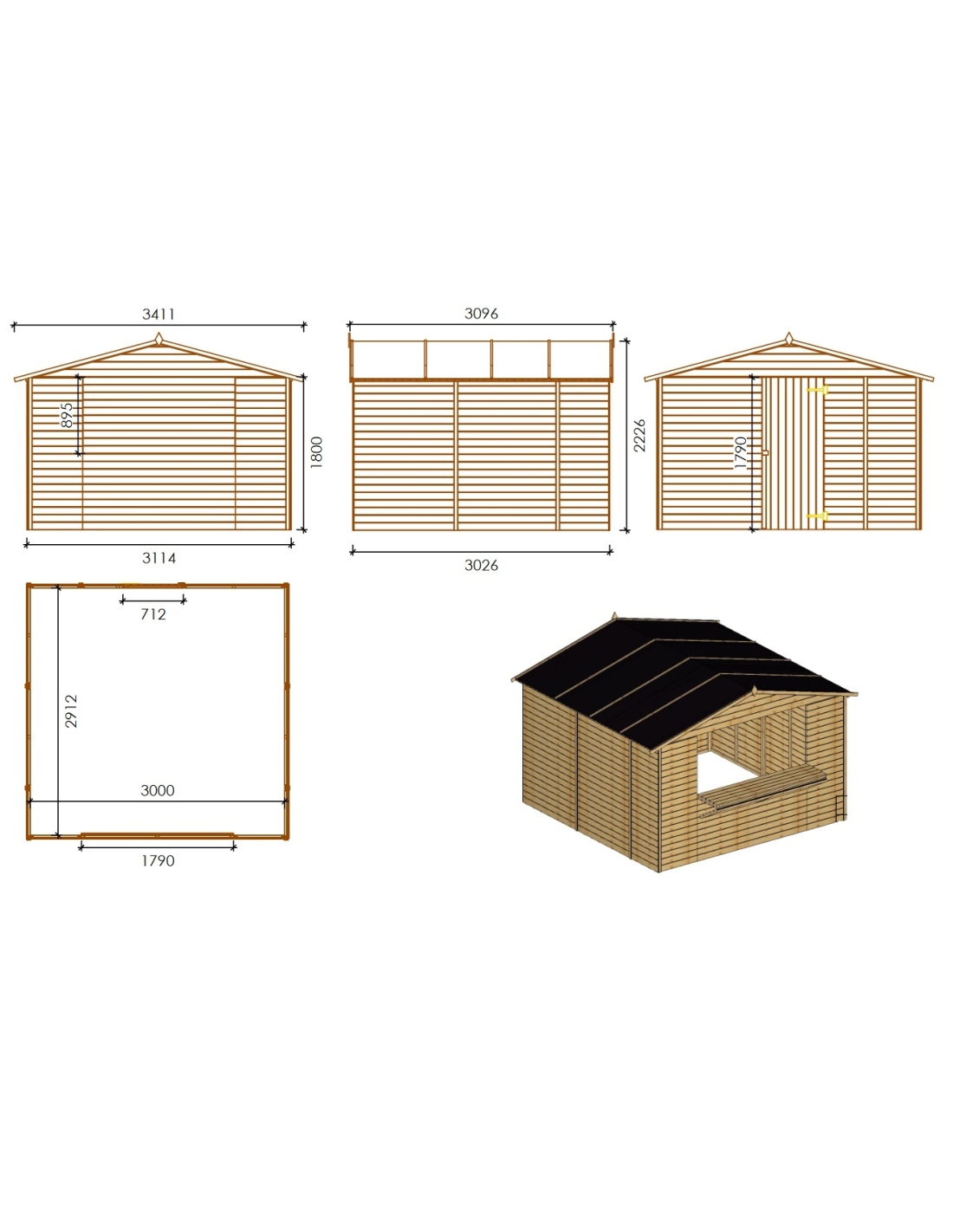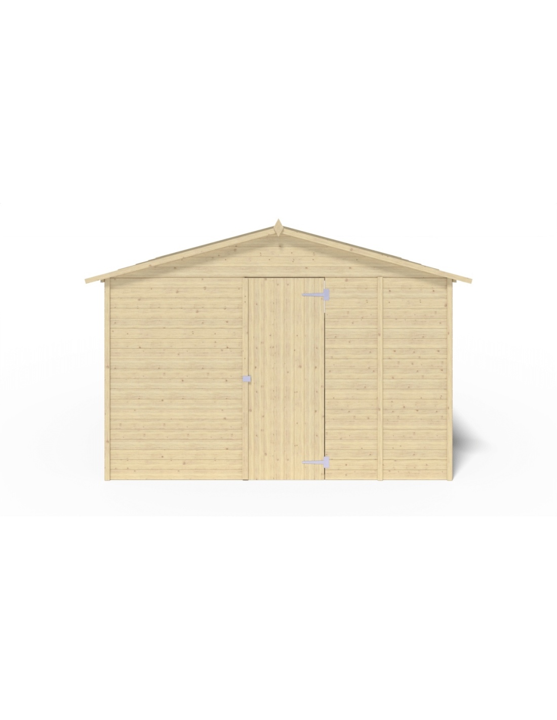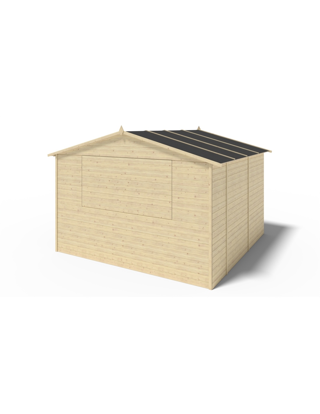Handels-Holzhaus DOM607 mit einer Fläche von 9.42 m2, einer Frontbreite von 3.11 m, einer Tiefe von 3.03 m und einer Wandstärke von 19 mm. Die Montage des Schuppens mit der im Produkt enthaltenen Anleitung ist unkompliziert.