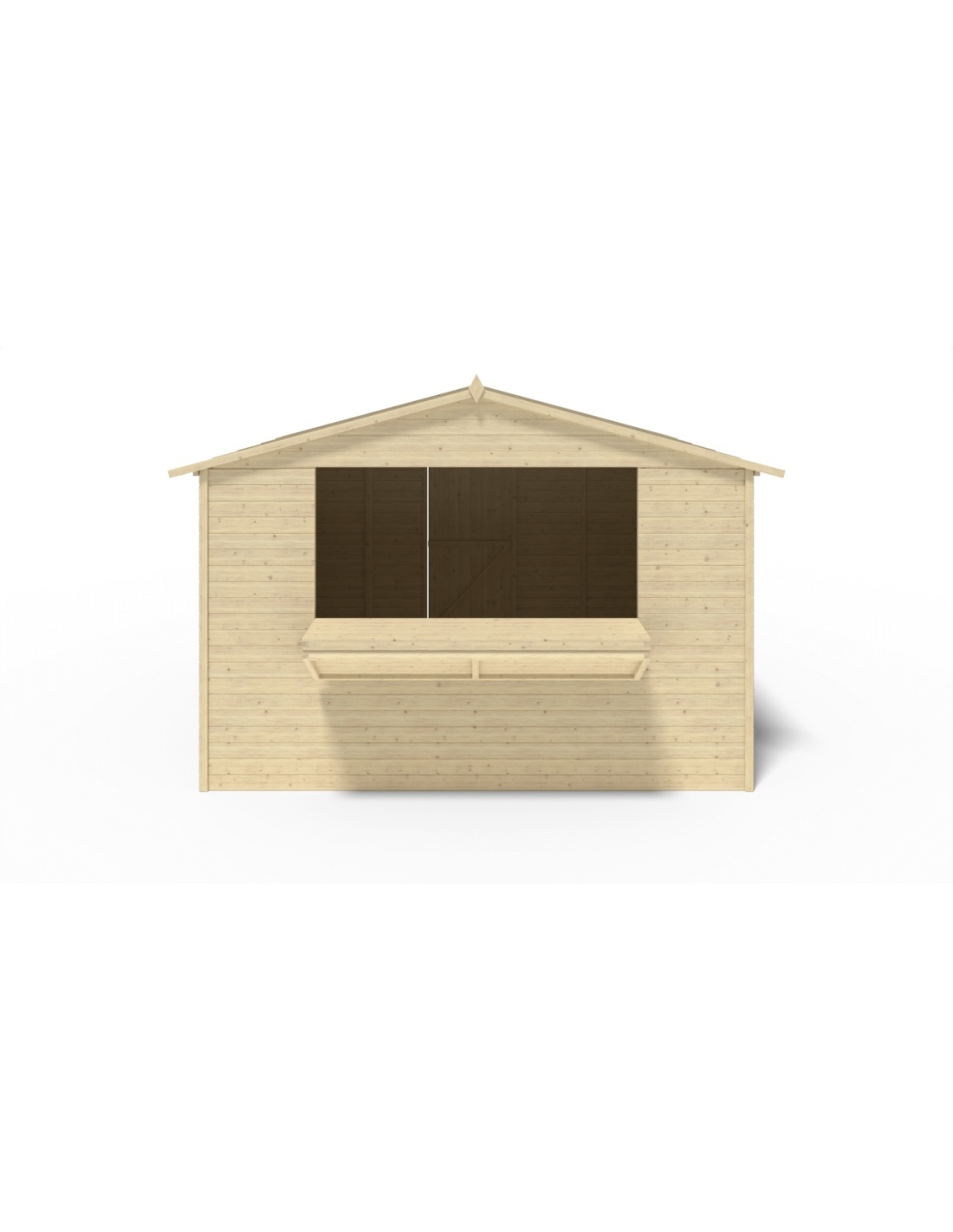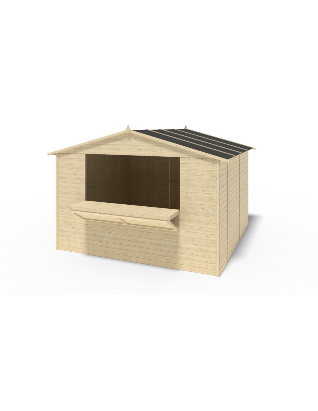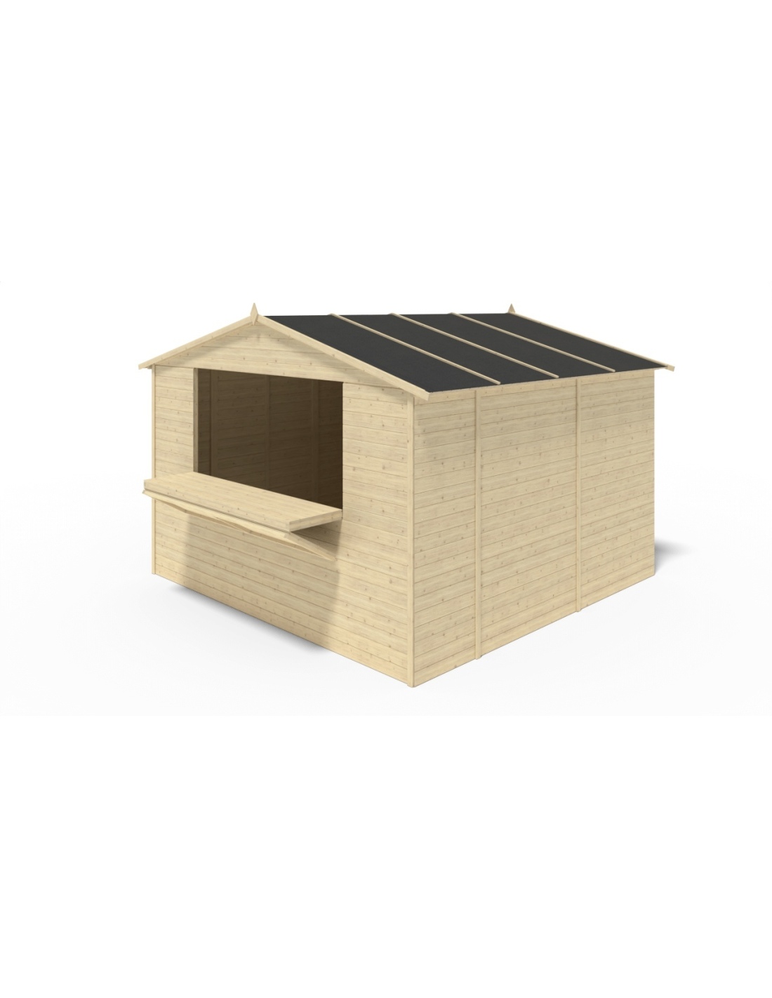 Handels-Holzhaus DOM607 mit einer Fläche von 9.42 m2, einer Frontbreite von 3.11 m, einer Tiefe von 3.03 m und einer Wandstärke von 19 mm. Die Montage des Schuppens mit der im Produkt enthaltenen Anleitung ist unkompliziert.