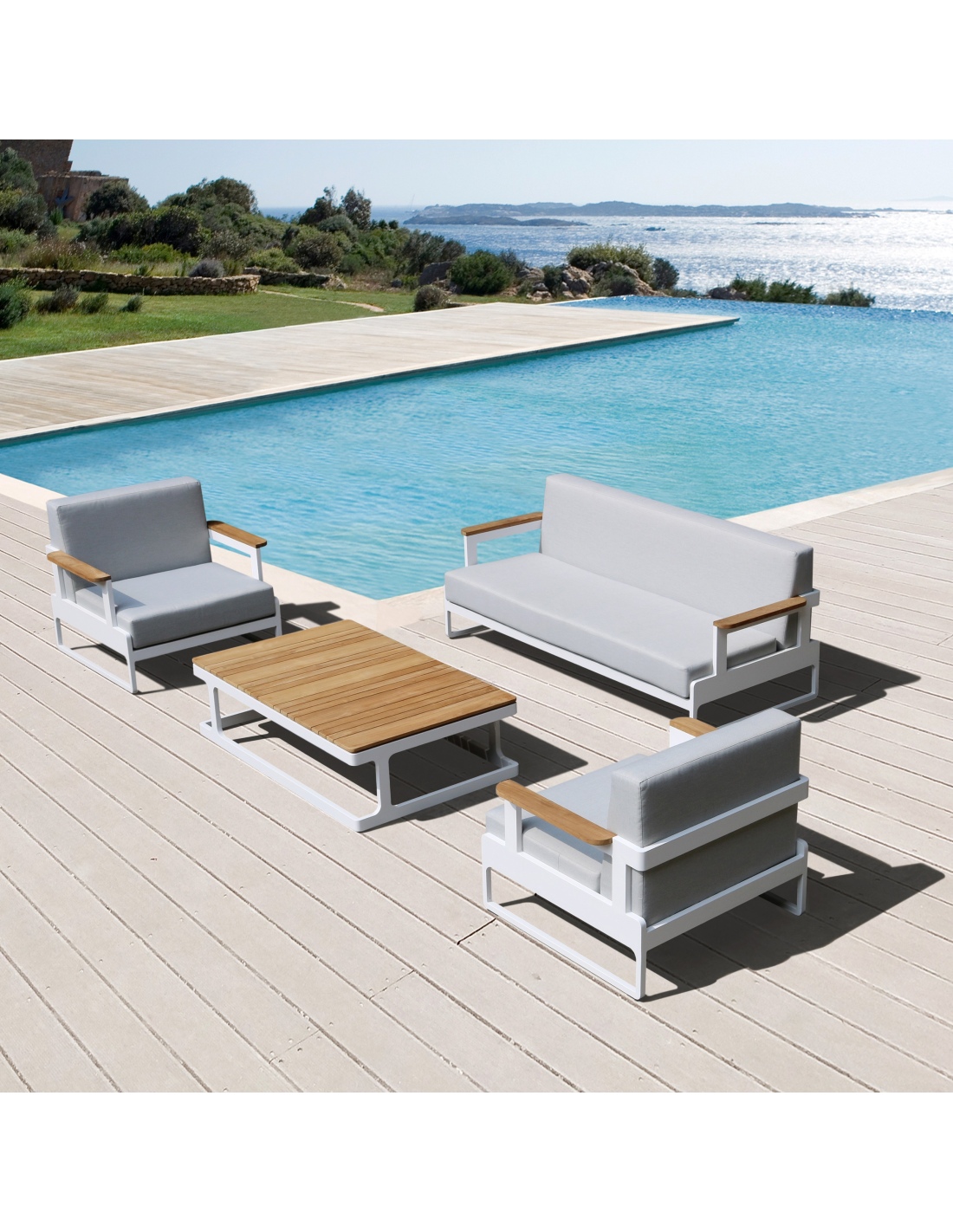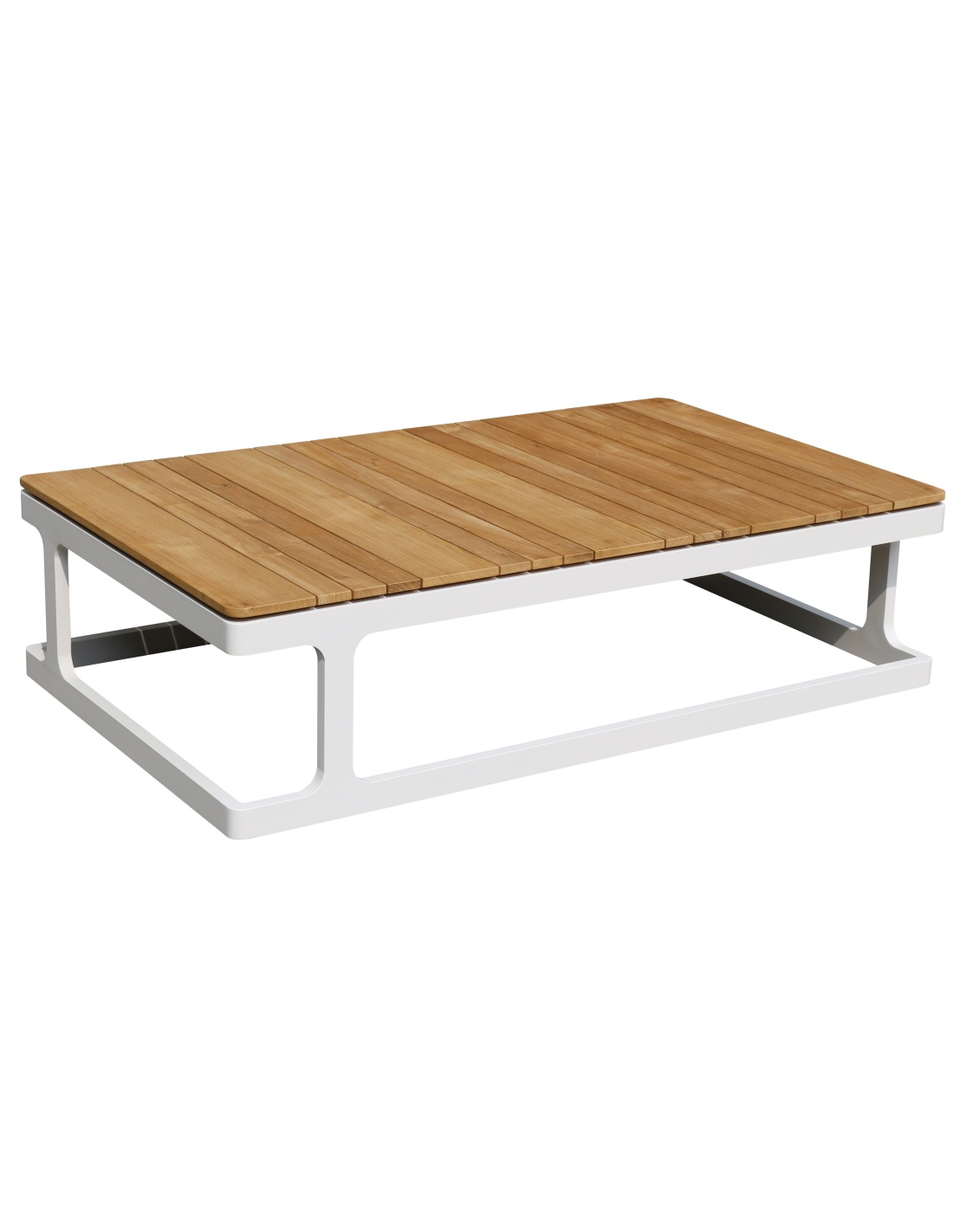 Bank mit Gesamtmaßen von 140x85xH.37 cm. Leichter Aluminiumrahmen, pulverbeschichtet in Weiß RAL9010. Teakholzplatte mit einer Stärke von 18 mm. Das Produkt wird komplett montiert verkauft.