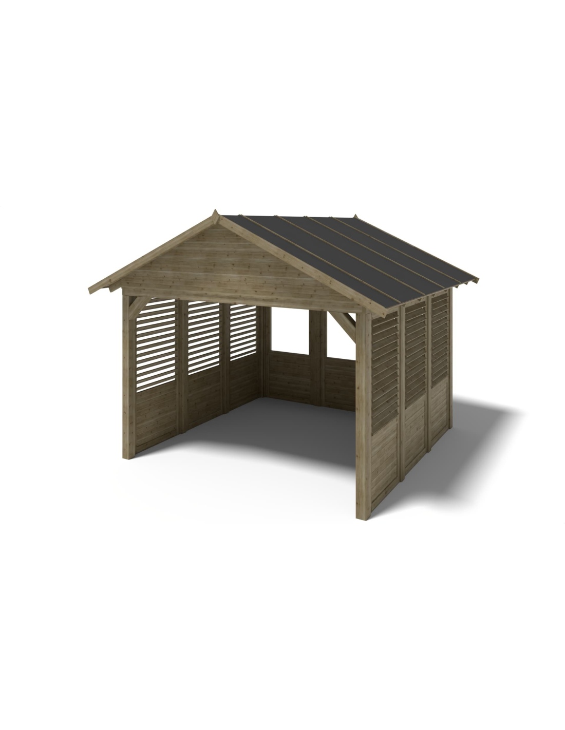 Gartenpavillon mit einer Fläche von 16.3 m2, stabilen 120x120 mm Eckpfosten, aus grün imprägniertem, getrocknetem Fichtenholz.