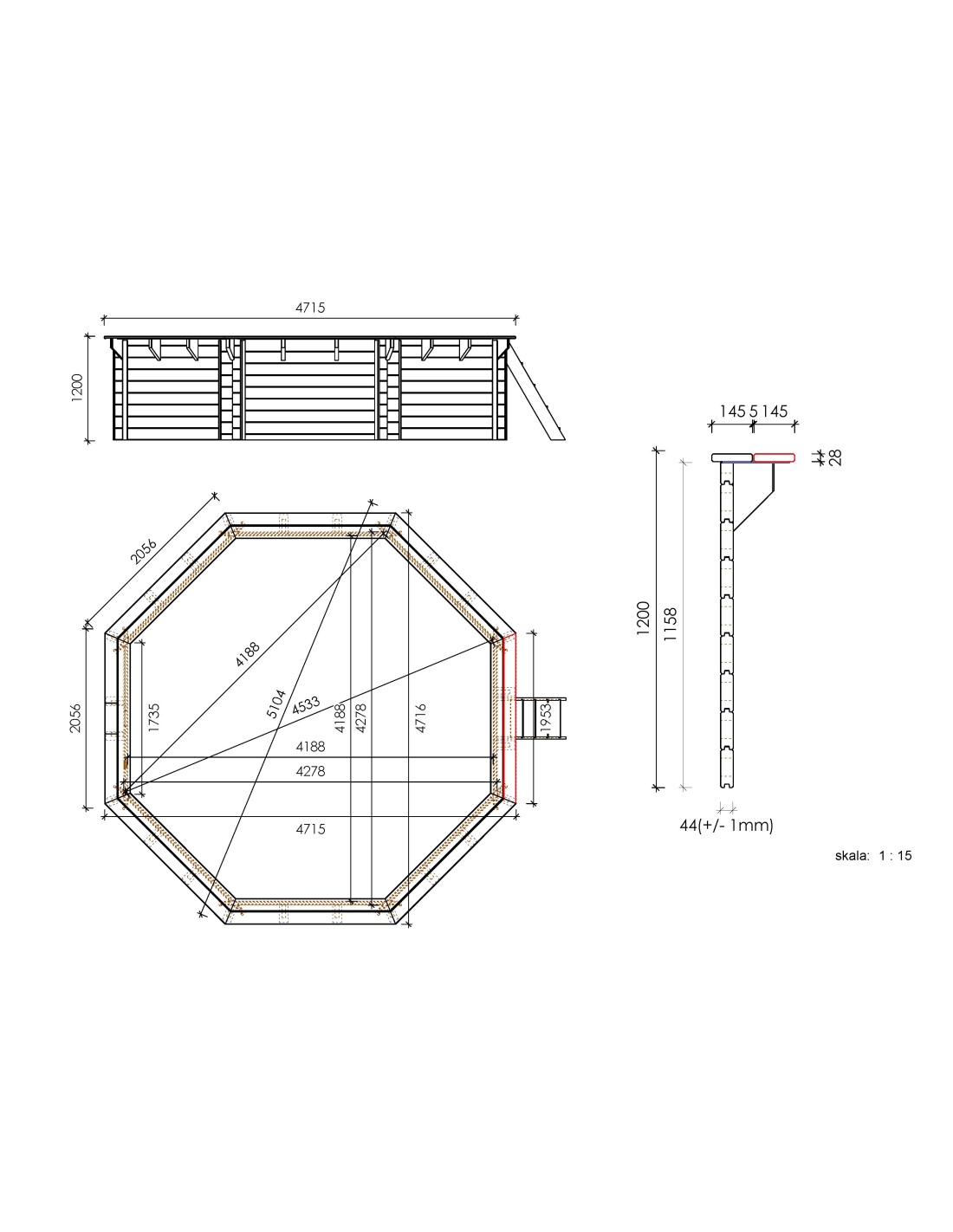 Wir bieten einen hölzernen Gartenpool mit den Maßen 4.71 m x 4.72 m und einer Höhe von 1.2 m, hergestellt aus Kiefernholz und imprägniert in der Farbe Grün. Die Stärke der Bretter beträgt 44 mm (+/- 1 mm), was eine sehr solide Poolkonstruktion gewährleistet. Die Stärke der Terrassendielen beträgt 28 mm.