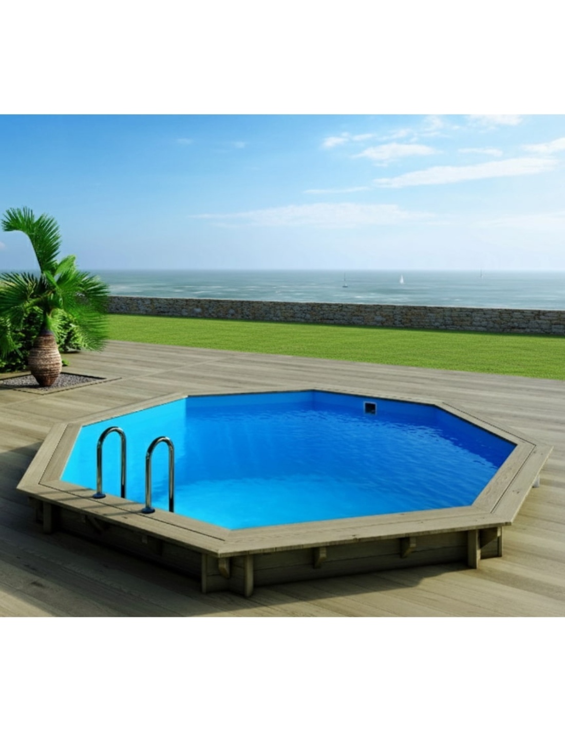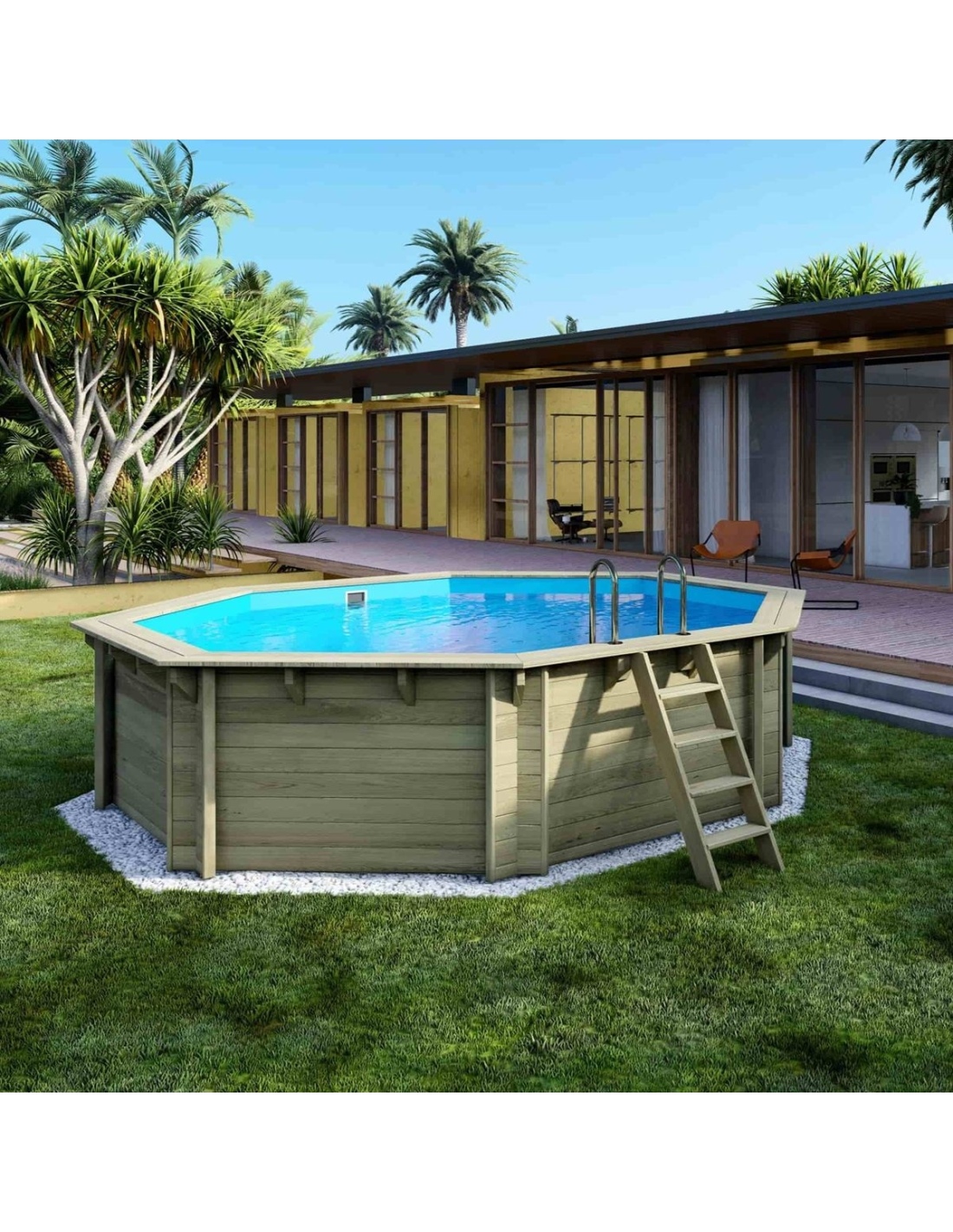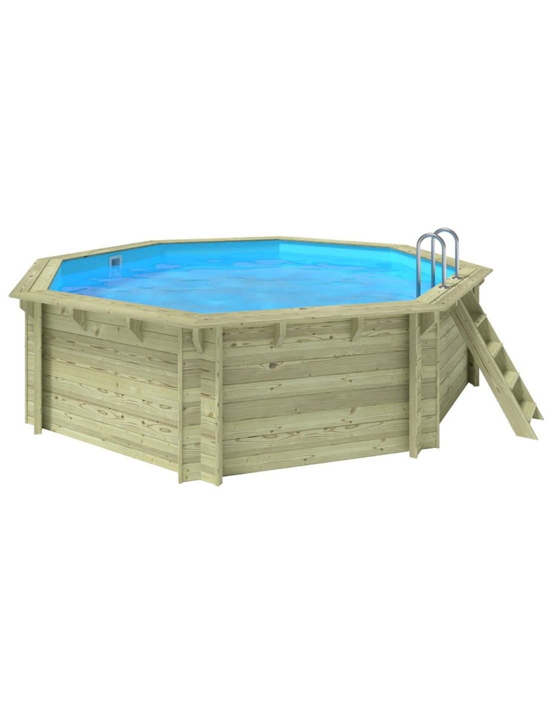 Der Pool besteht aus imprägniertem Kiefernholz, das nicht nur optisch überzeugt, sondern dank des Imprägnierungsprozesses:
