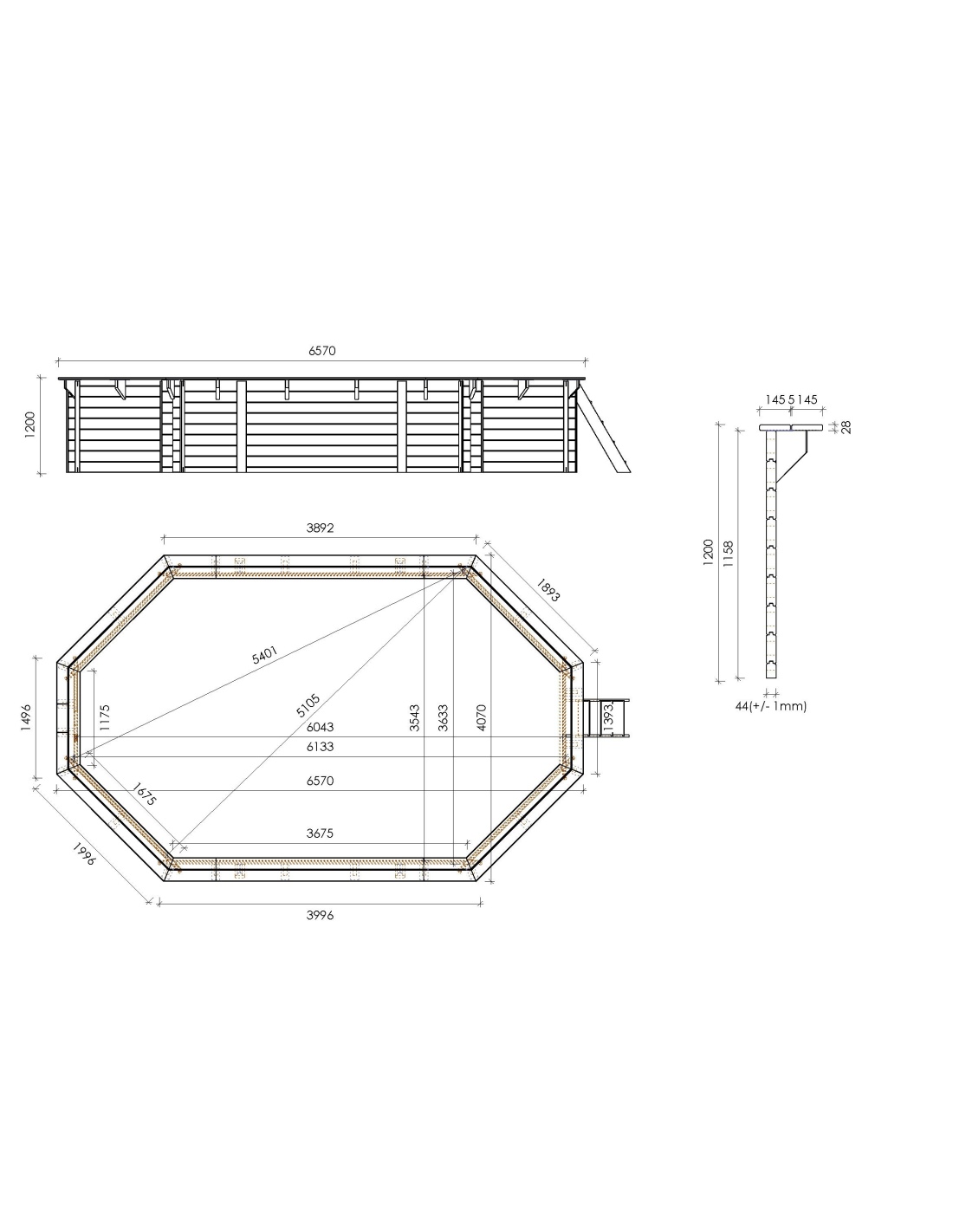 Wir bieten einen hölzernen Gartenpool mit den Maßen 6.57 m x 4.07 m und einer Höhe von 1.2 m, hergestellt aus Kiefernholz und imprägniert in der Farbe Grün. Die Stärke der Bretter beträgt 44 mm (+/- 1 mm), was eine sehr solide Poolkonstruktion gewährleistet. Die Stärke der Terrassendielen beträgt 28 mm.