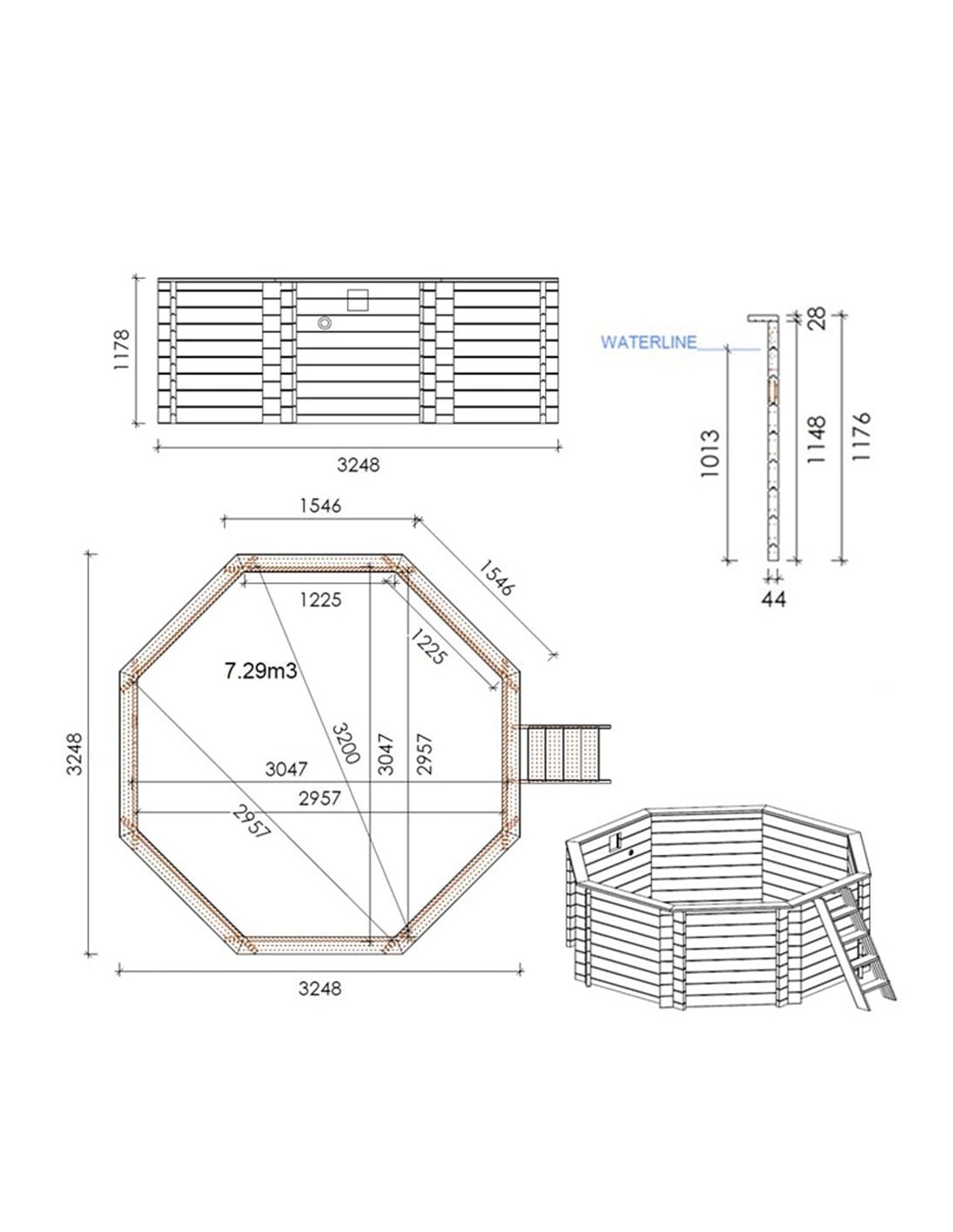 Wir bieten einen hölzernen Gartenpool mit den Maßen 3.25 m x 3.25 m und einer Höhe von 1.18 m, hergestellt aus Kiefernholz und imprägniert in der Farbe Grün. Die Stärke der Bretter beträgt 44 mm (+/- 1 mm), was eine sehr solide Poolkonstruktion gewährleistet. Die Stärke der Terrassendielen beträgt 28 mm.