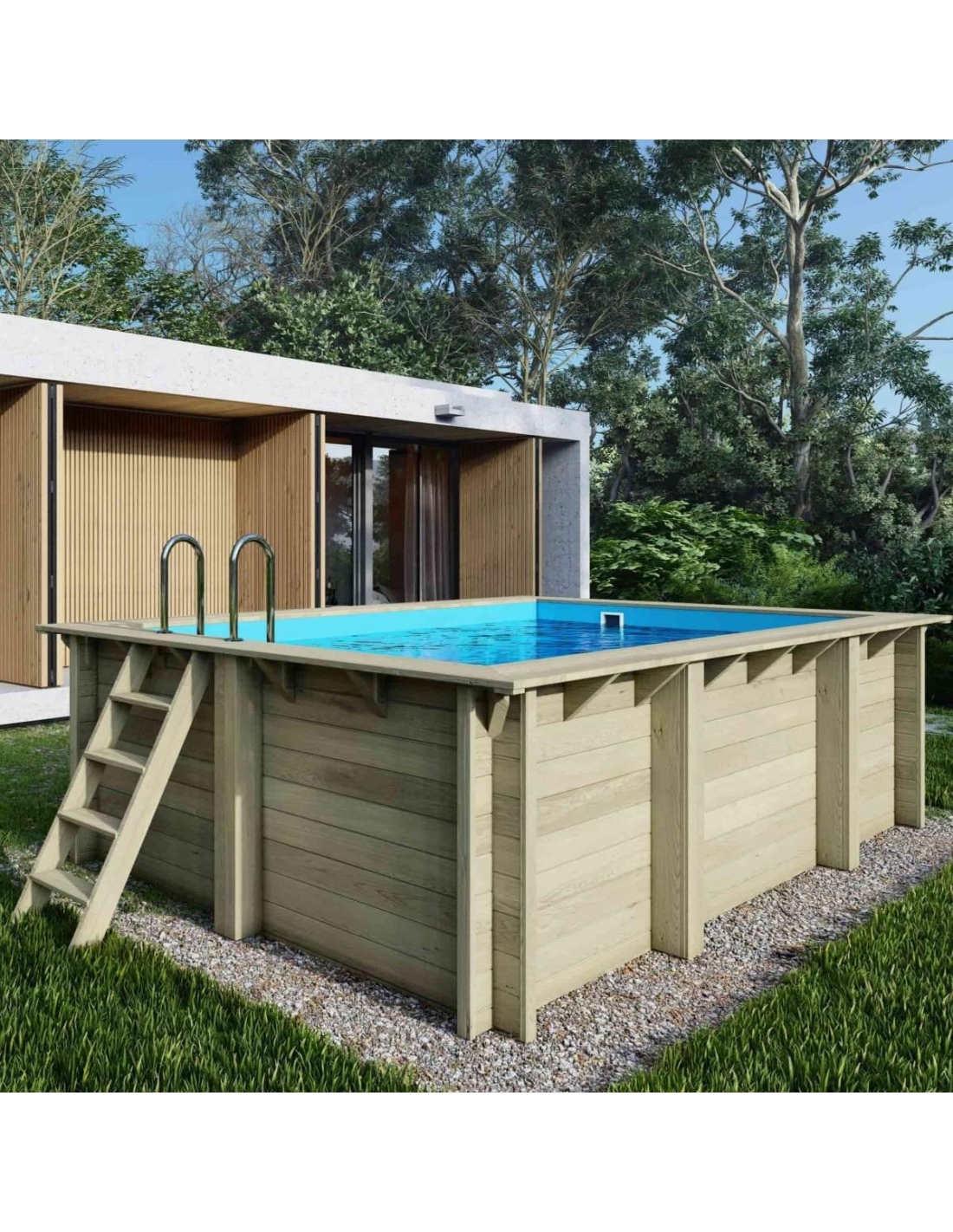 Der Pool besteht aus imprägniertem Kiefernholz, das nicht nur optisch überzeugt, sondern dank des Imprägnierungsprozesses: