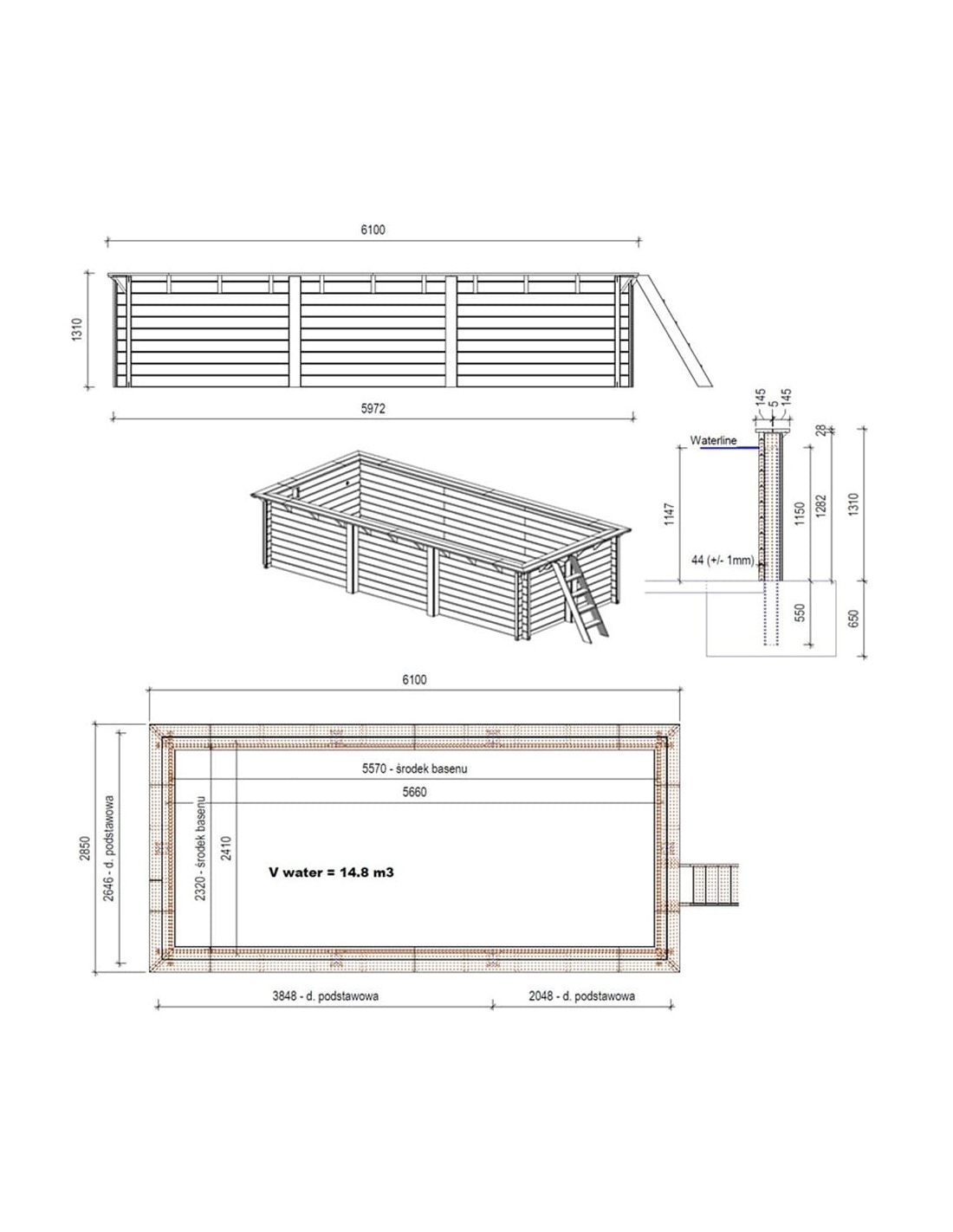 Wir bieten einen hölzernen Gartenpool mit den Maßen 6.1 m x 2.85 m und einer Höhe von 1.31 m, hergestellt aus Kiefernholz und imprägniert in der Farbe Grün. Die Stärke der Bretter beträgt 44 mm (+/- 1 mm), was eine sehr solide Poolkonstruktion gewährleistet. Die Stärke der Terrassendielen beträgt 28 mm.