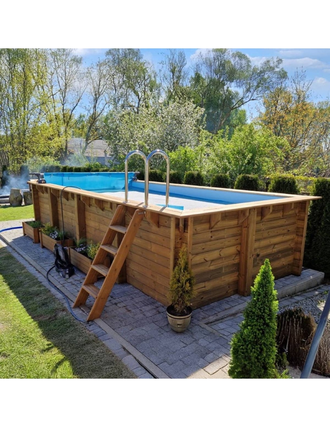 Der Pool besteht aus imprägniertem Kiefernholz, das nicht nur optisch überzeugt, sondern dank des Imprägnierungsprozesses: