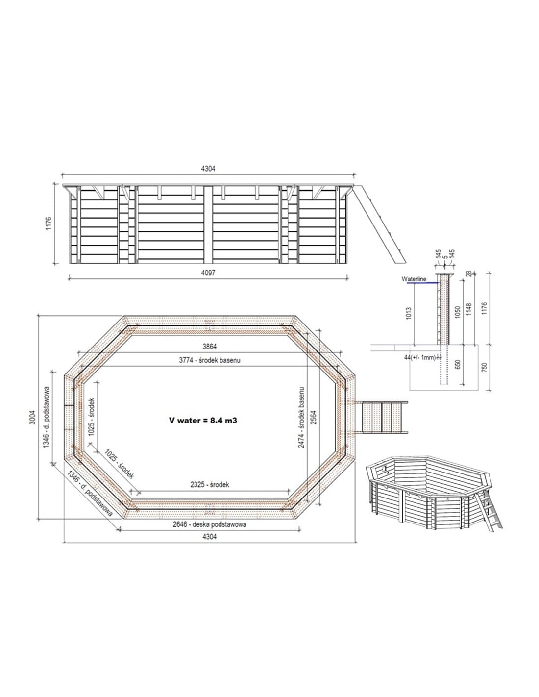 Wir bieten einen hölzernen Gartenpool mit den Maßen 4.3 m x 3 m und einer Höhe von 1.18 m, hergestellt aus Kiefernholz und imprägniert in der Farbe Grün. Die Stärke der Bretter beträgt 44 mm (+/- 1 mm), was eine sehr solide Poolkonstruktion gewährleistet. Die Stärke der Terrassendielen beträgt 28 mm.