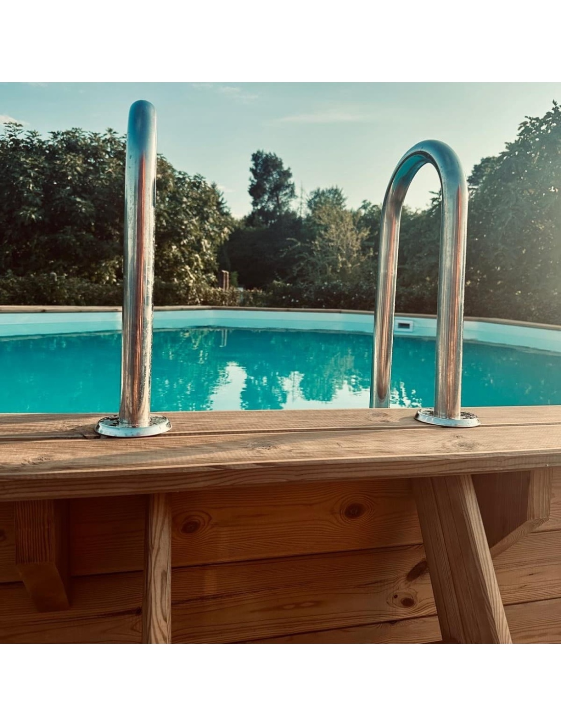 Der Pool besteht aus imprägniertem Kiefernholz, das nicht nur optisch überzeugt, sondern dank des Imprägnierungsprozesses:
