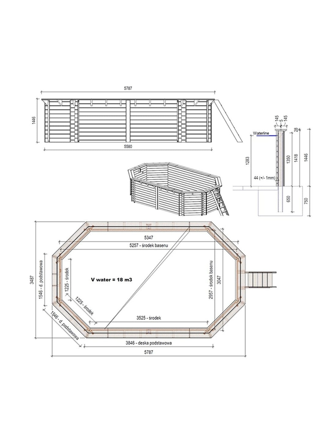 Wir bieten einen hölzernen Gartenpool mit den Maßen 5.79 m x 3.49 m und einer Höhe von 1.45 m, hergestellt aus Kiefernholz und imprägniert in der Farbe Grün. Die Stärke der Bretter beträgt 44 mm (+/- 1 mm), was eine sehr solide Poolkonstruktion gewährleistet. Die Stärke der Terrassendielen beträgt 28 mm.