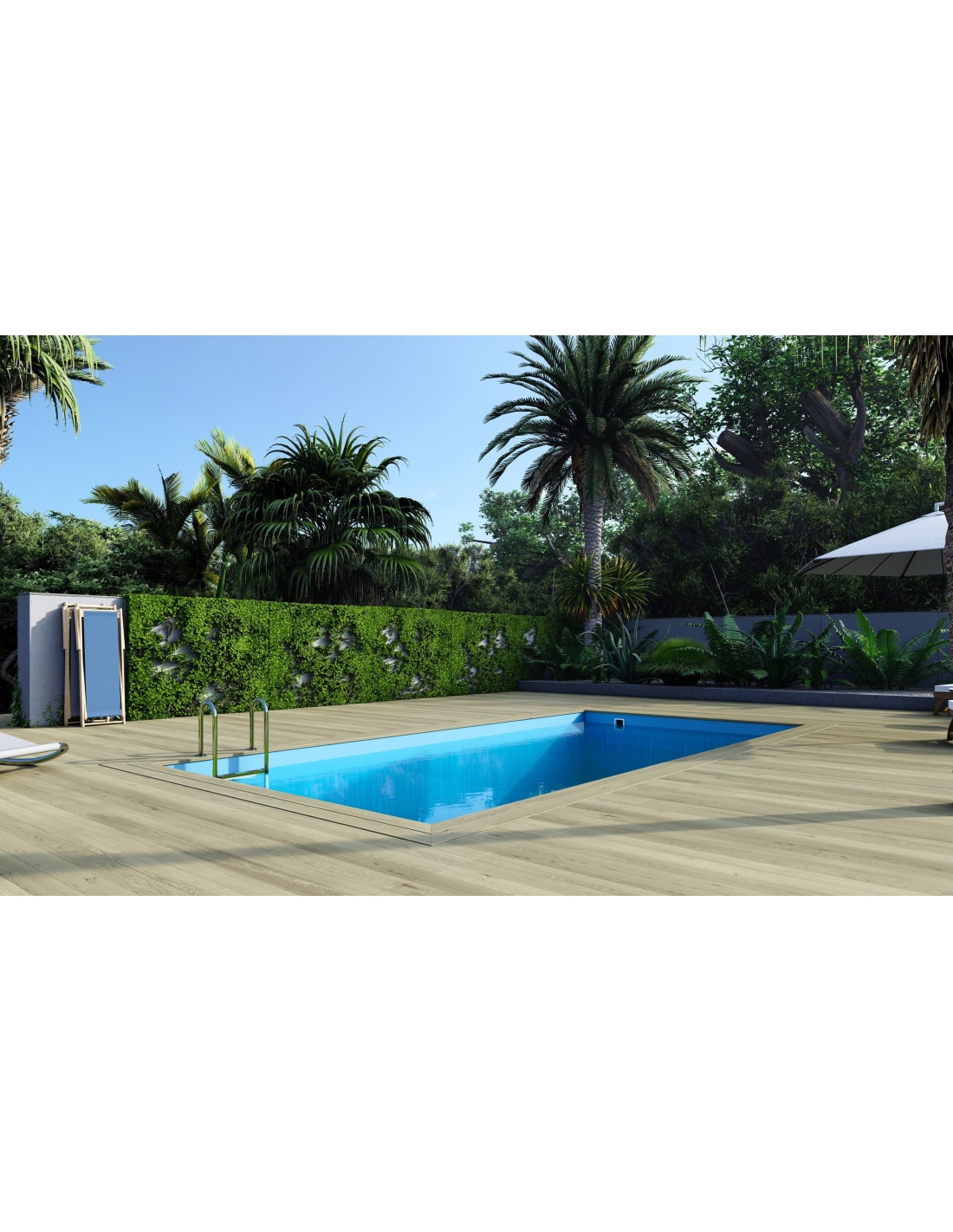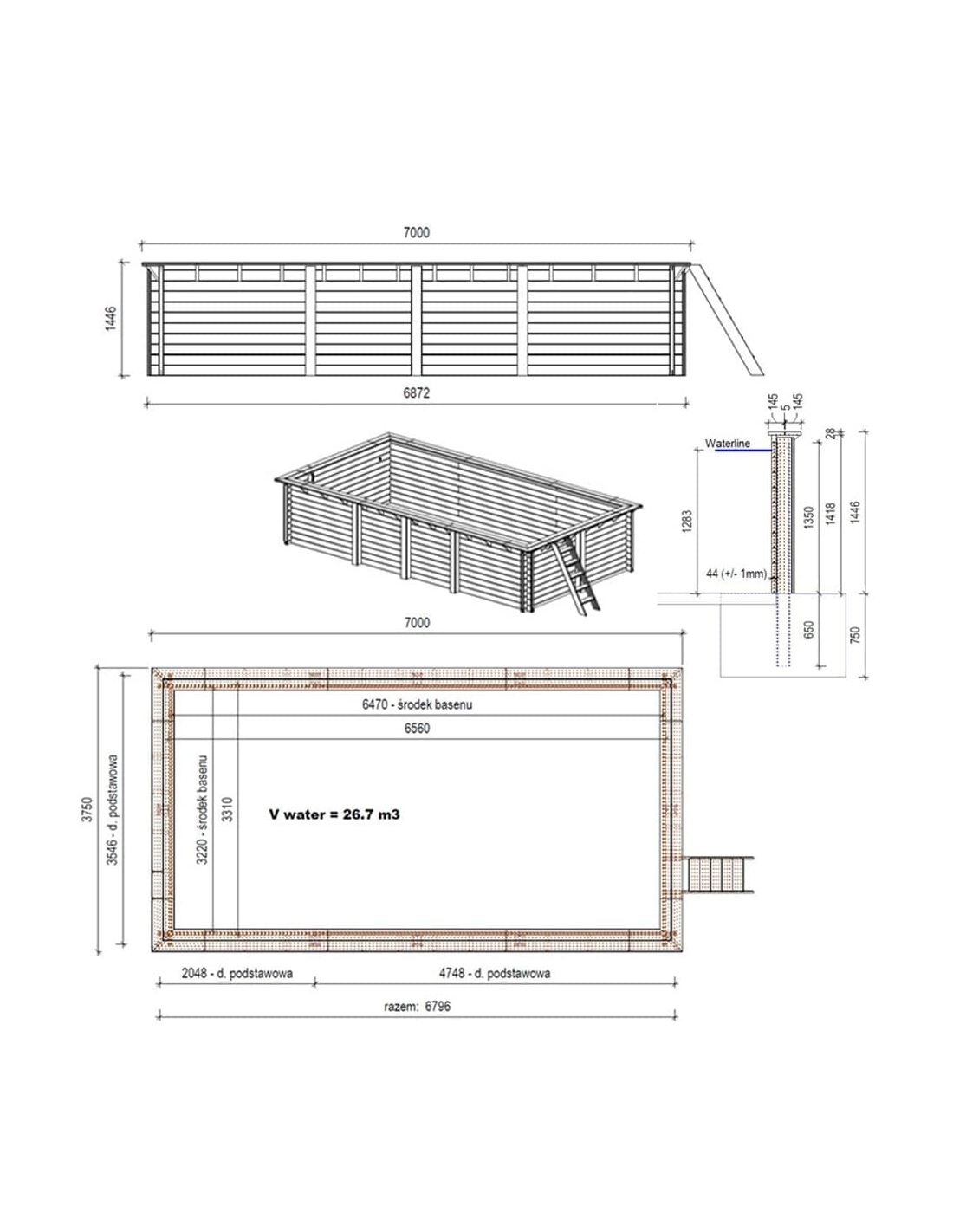 Wir bieten einen hölzernen Gartenpool mit den Maßen 7 m x 3.75 m und einer Höhe von 1.45 m, hergestellt aus Kiefernholz und imprägniert in der Farbe Grün. Die Stärke der Bretter beträgt 44 mm (+/- 1 mm), was eine sehr solide Poolkonstruktion gewährleistet. Die Stärke der Terrassendielen beträgt 28 mm.