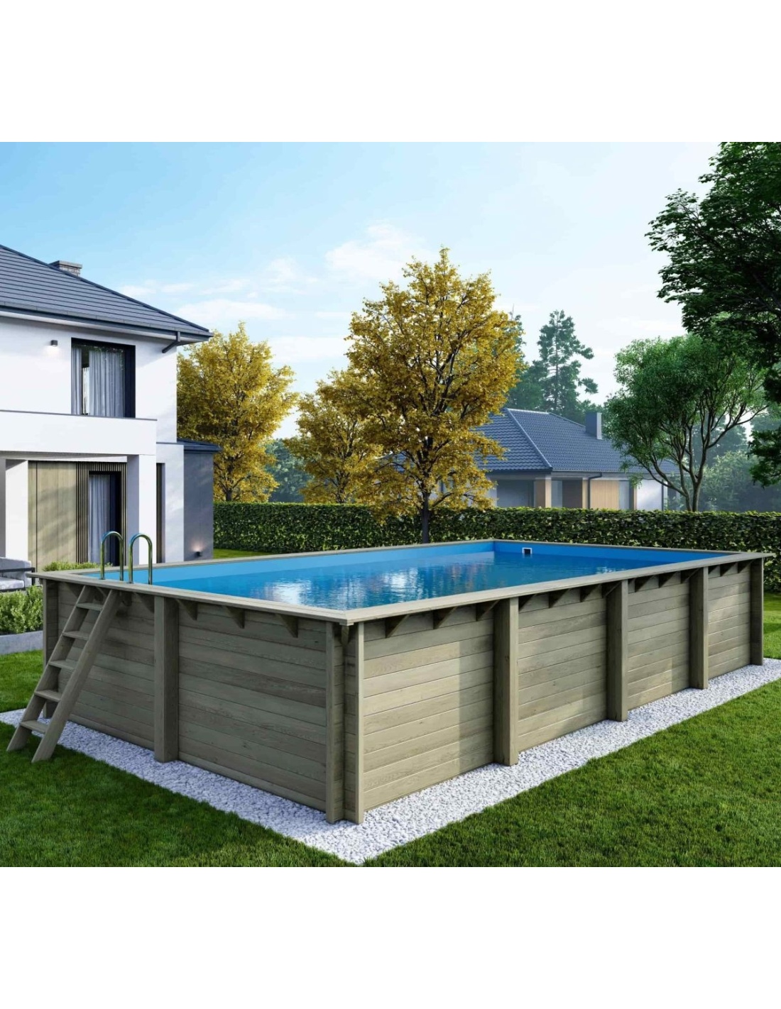 Der Pool besteht aus imprägniertem Kiefernholz, das nicht nur optisch überzeugt, sondern dank des Imprägnierungsprozesses: