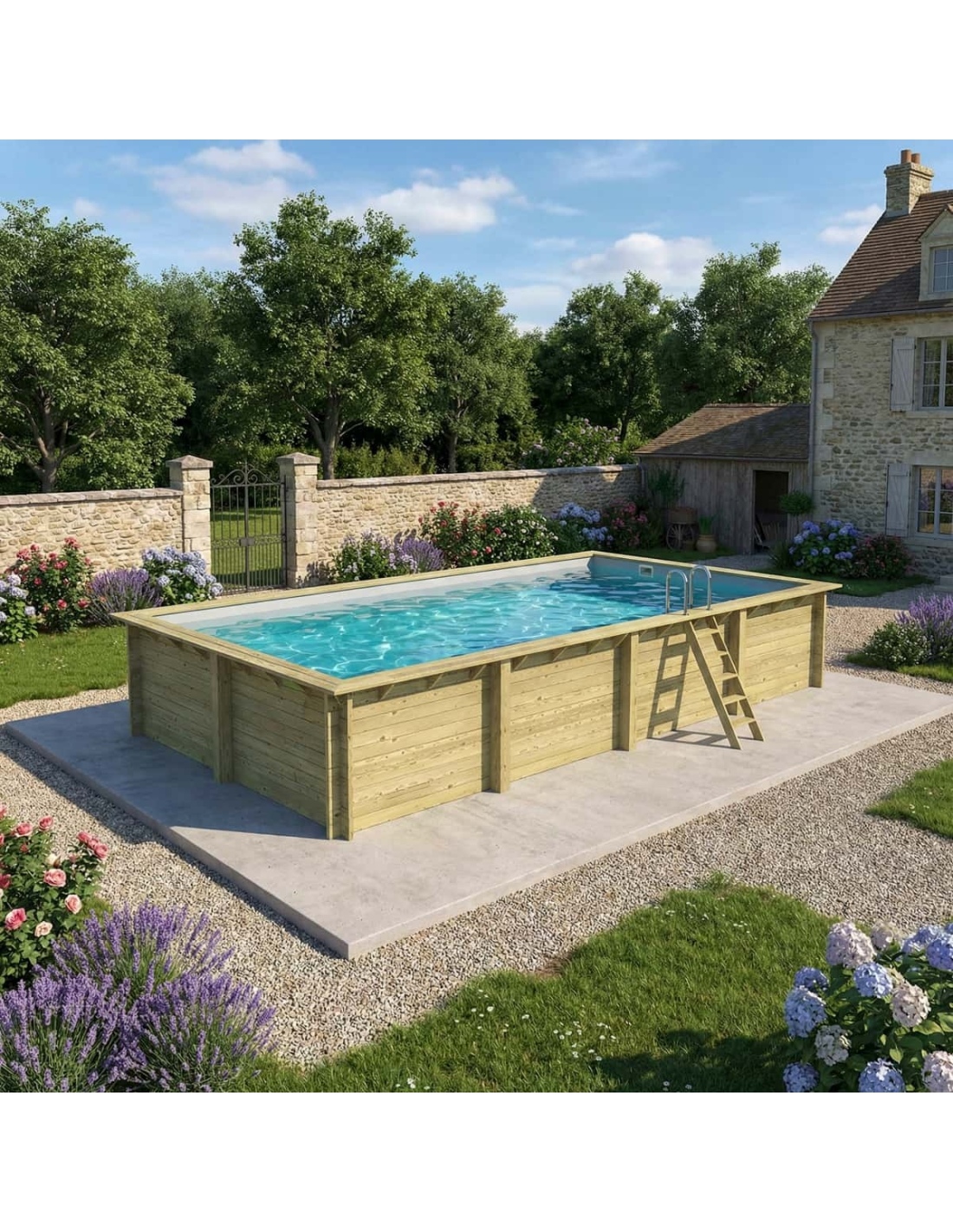 Holz verleiht der Umgebung einen eleganten und gemütlichen Charakter, und sein klassisches Erscheinungsbild sorgt dafür, dass sich der Pool harmonisch in jede Gartenart einfügt. Sie können Holzterrassen, Pflanzen oder dekorative Beleuchtung ergänzen, um eine besonders stimmungsvolle Atmosphäre zu schaffen.