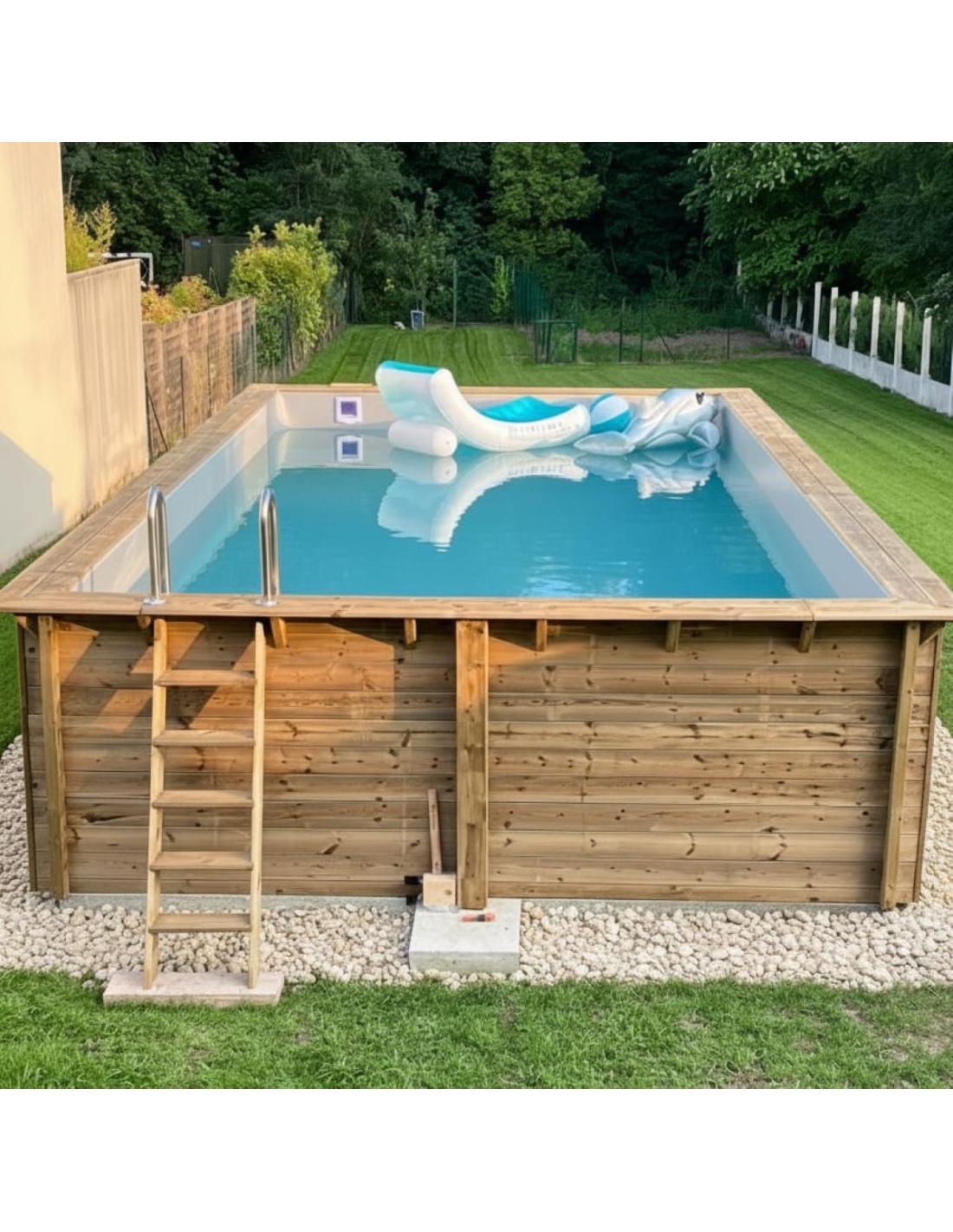 Holz verleiht der Umgebung einen eleganten und gemütlichen Charakter, und sein klassisches Erscheinungsbild sorgt dafür, dass sich der Pool harmonisch in jede Gartenart einfügt. Sie können Holzterrassen, Pflanzen oder dekorative Beleuchtung ergänzen, um eine besonders stimmungsvolle Atmosphäre zu schaffen.