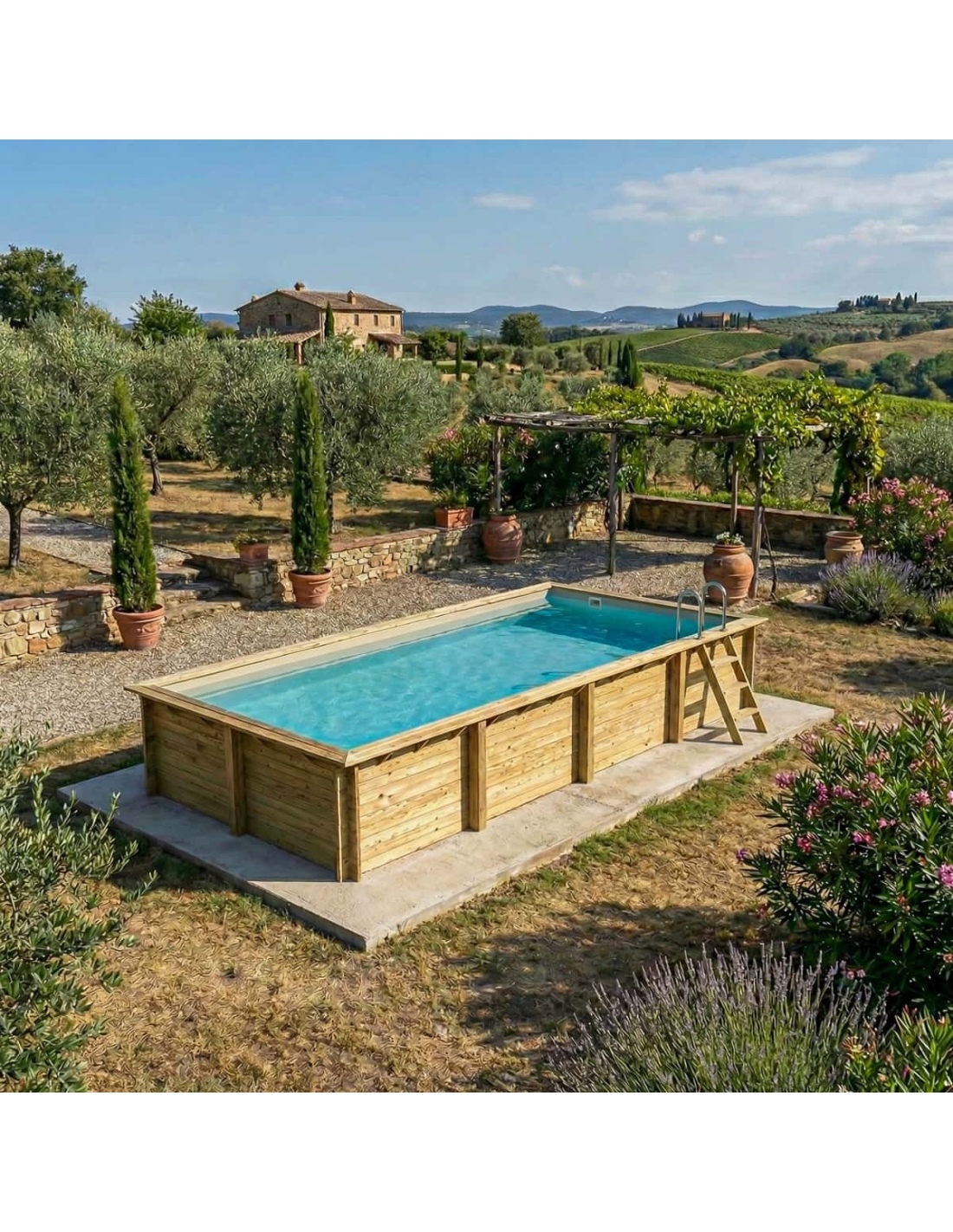 Holz verleiht der Umgebung einen eleganten und gemütlichen Charakter, und sein klassisches Erscheinungsbild sorgt dafür, dass sich der Pool harmonisch in jede Gartenart einfügt. Sie können Holzterrassen, Pflanzen oder dekorative Beleuchtung ergänzen, um eine besonders stimmungsvolle Atmosphäre zu schaffen.