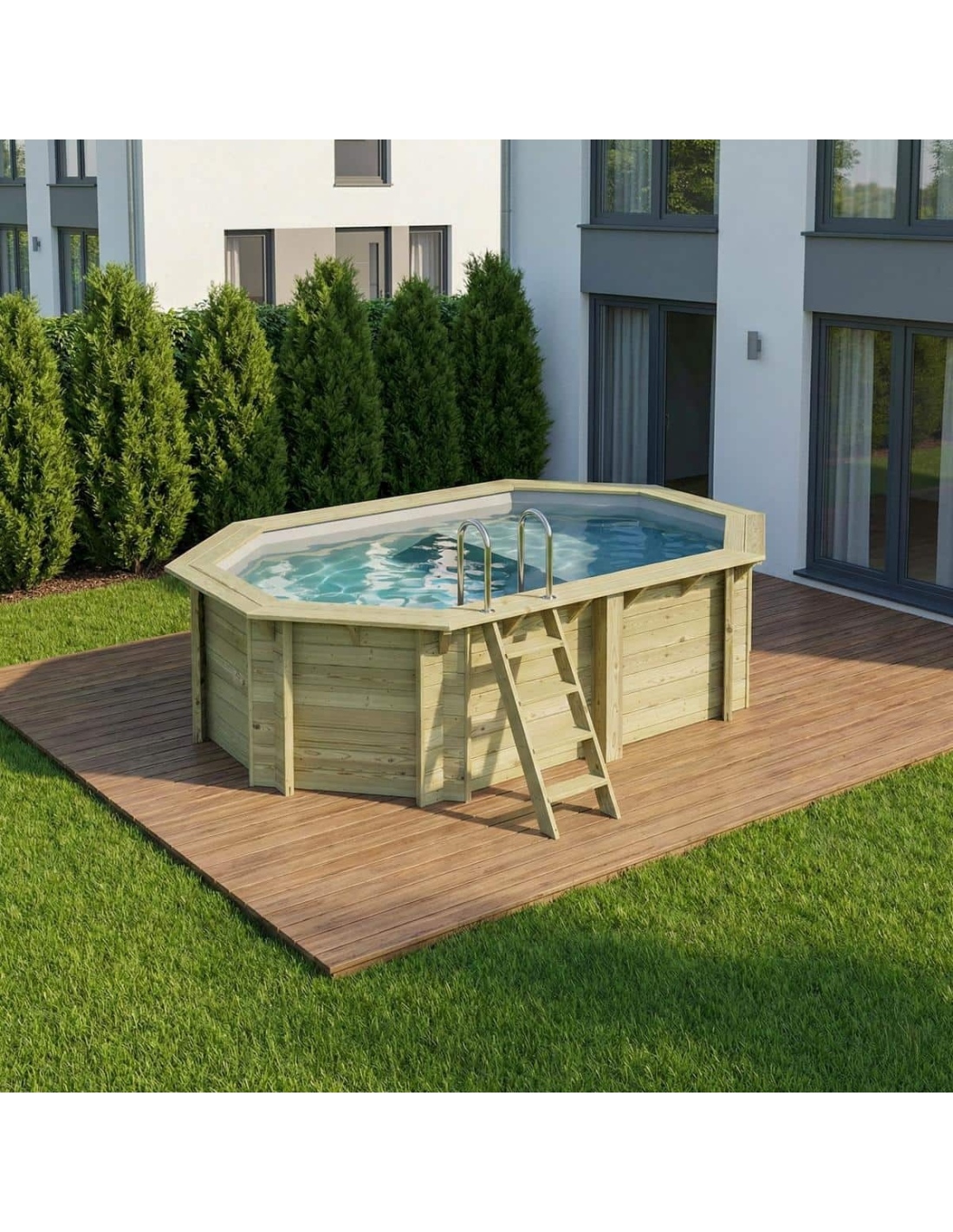 Der Pool besteht aus imprägniertem Kiefernholz, das nicht nur optisch überzeugt, sondern dank des Imprägnierungsprozesses: