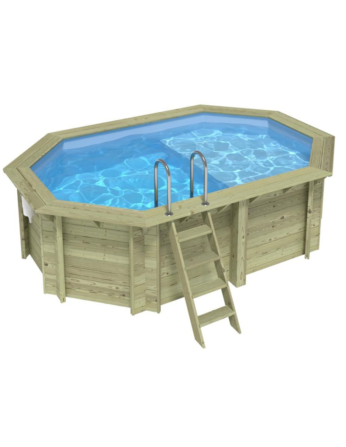 Der Pool besteht aus imprägniertem Kiefernholz, das nicht nur optisch überzeugt, sondern dank des Imprägnierungsprozesses: