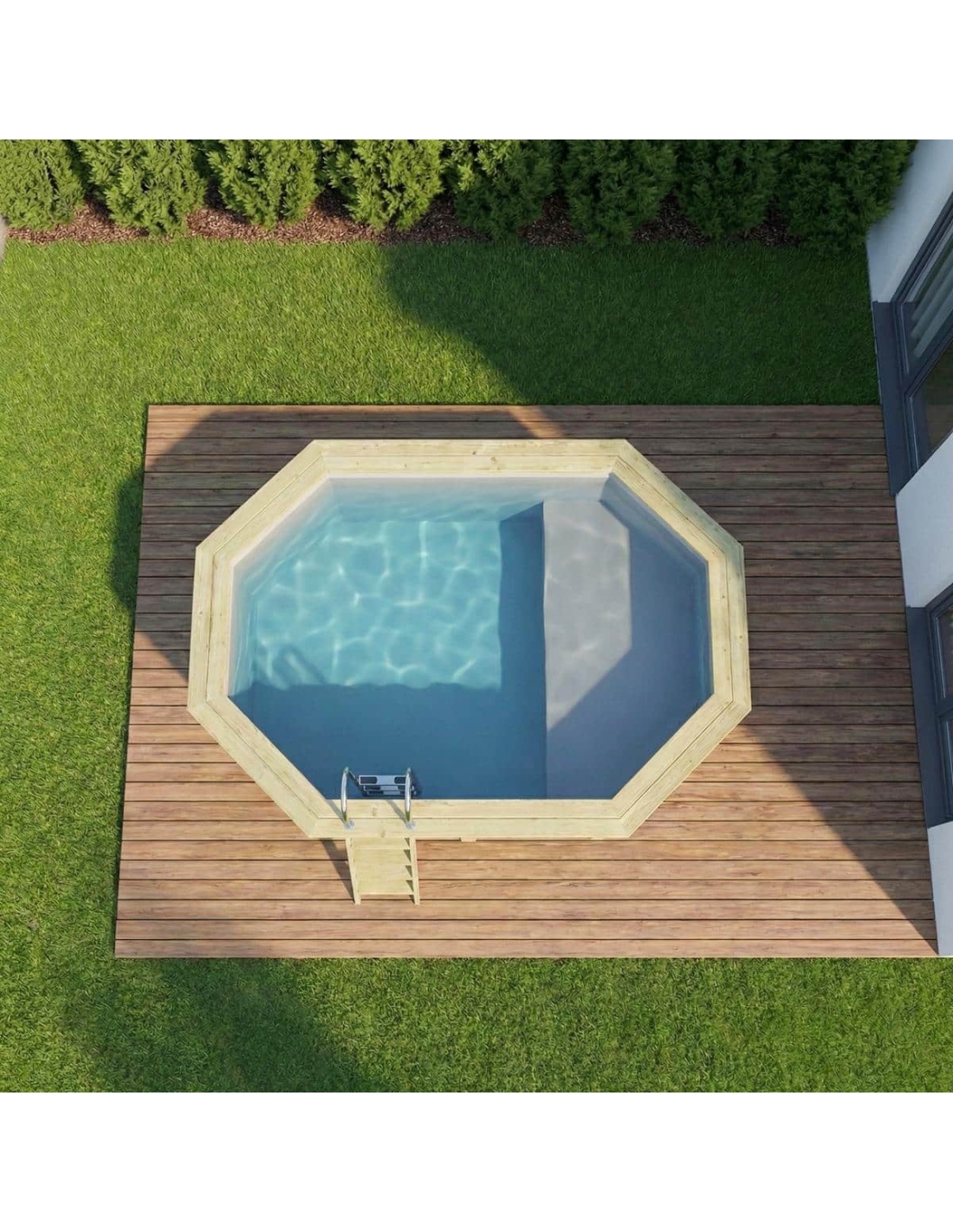 Entdecken Sie einen Pool, der die natürliche Schönheit von Holz, eine stabile Konstruktion und eine besondere flache Entspannungszone vereint.