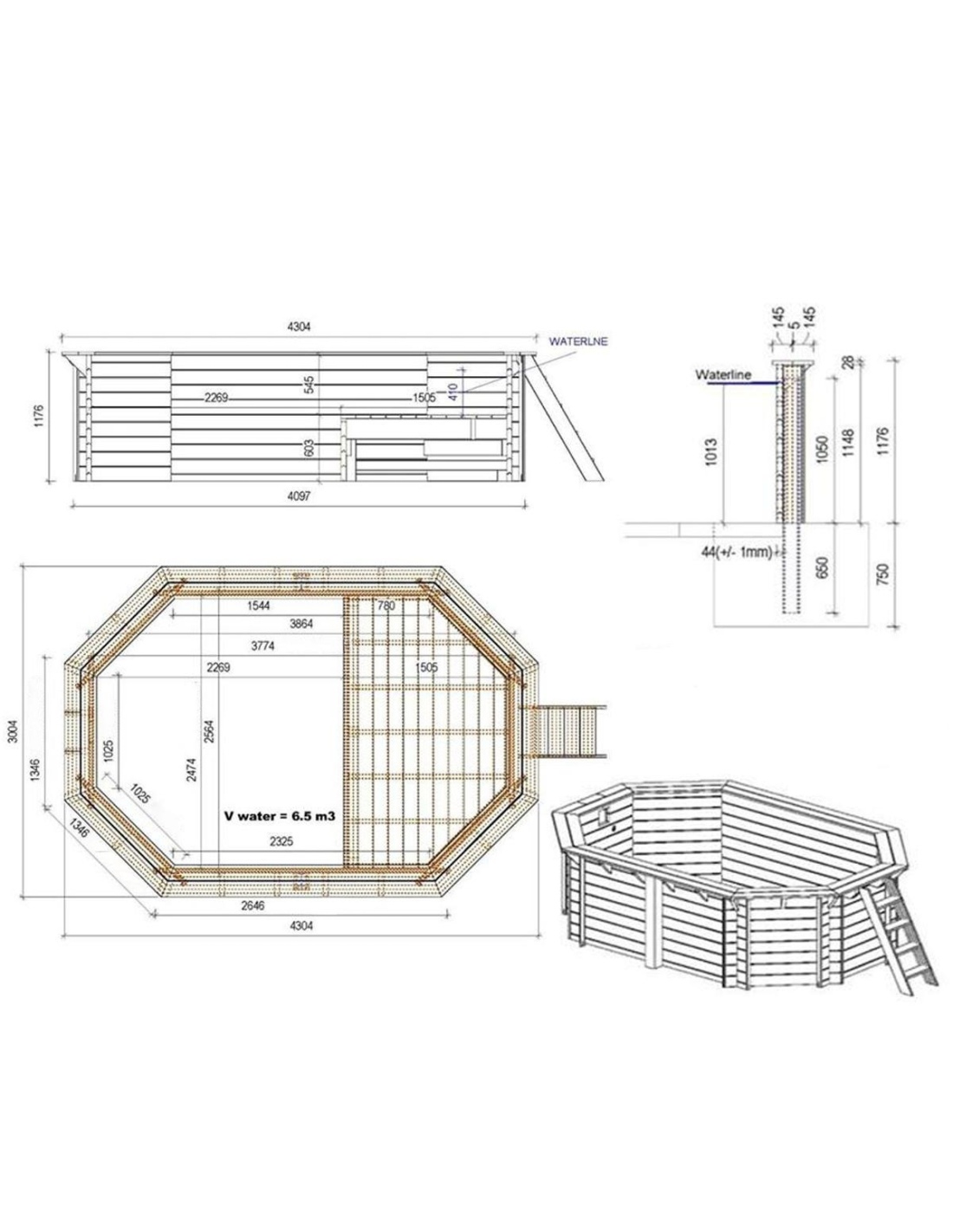 Der Pool besteht aus imprägniertem Kiefernholz, das nicht nur optisch überzeugt, sondern dank des Imprägnierungsprozesses: