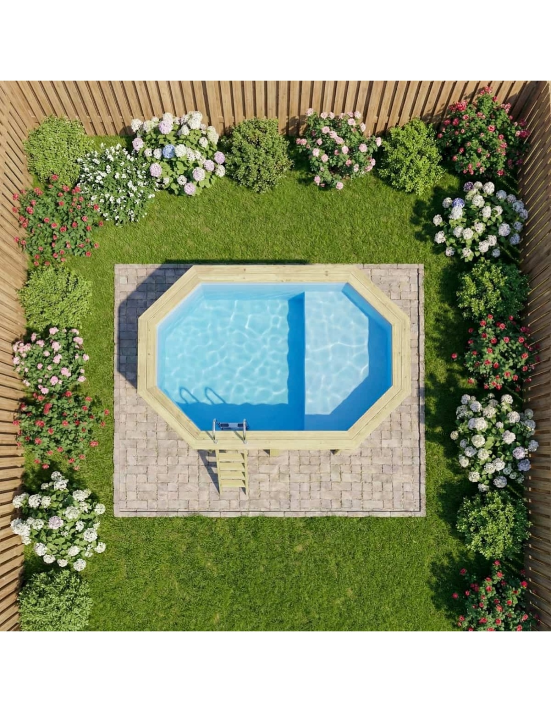 Holz verleiht der Umgebung einen eleganten und gemütlichen Charakter, und sein klassisches Erscheinungsbild sorgt dafür, dass sich der Pool harmonisch in jede Gartenart einfügt. Sie können Holzterrassen, Pflanzen oder dekorative Beleuchtung ergänzen, um eine besonders stimmungsvolle Atmosphäre zu schaffen.