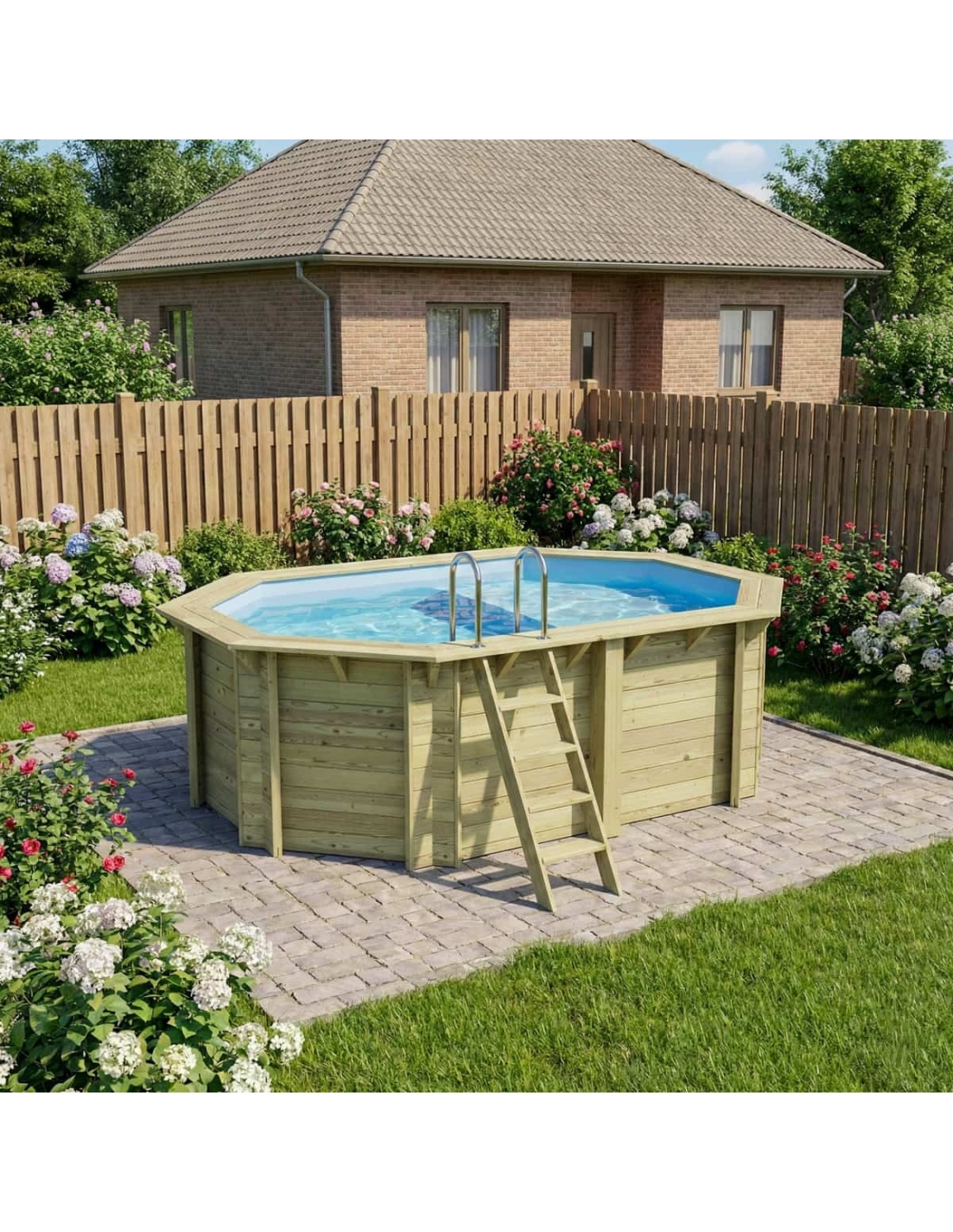 Der Pool besteht aus imprägniertem Kiefernholz, das nicht nur optisch überzeugt, sondern dank des Imprägnierungsprozesses: