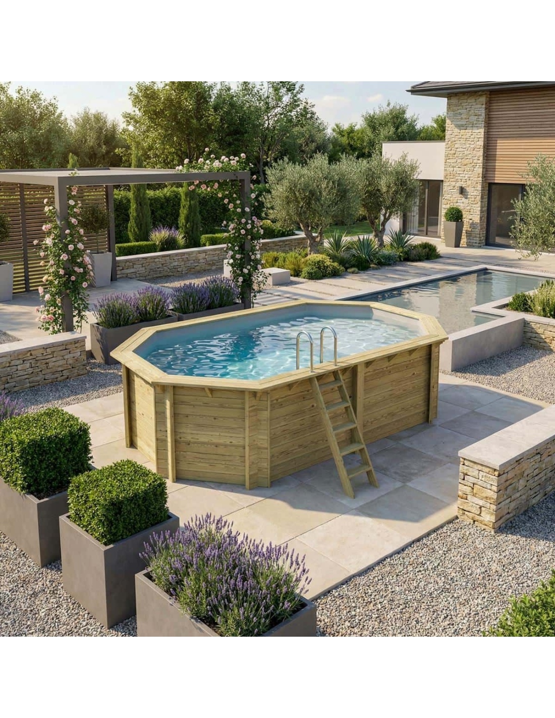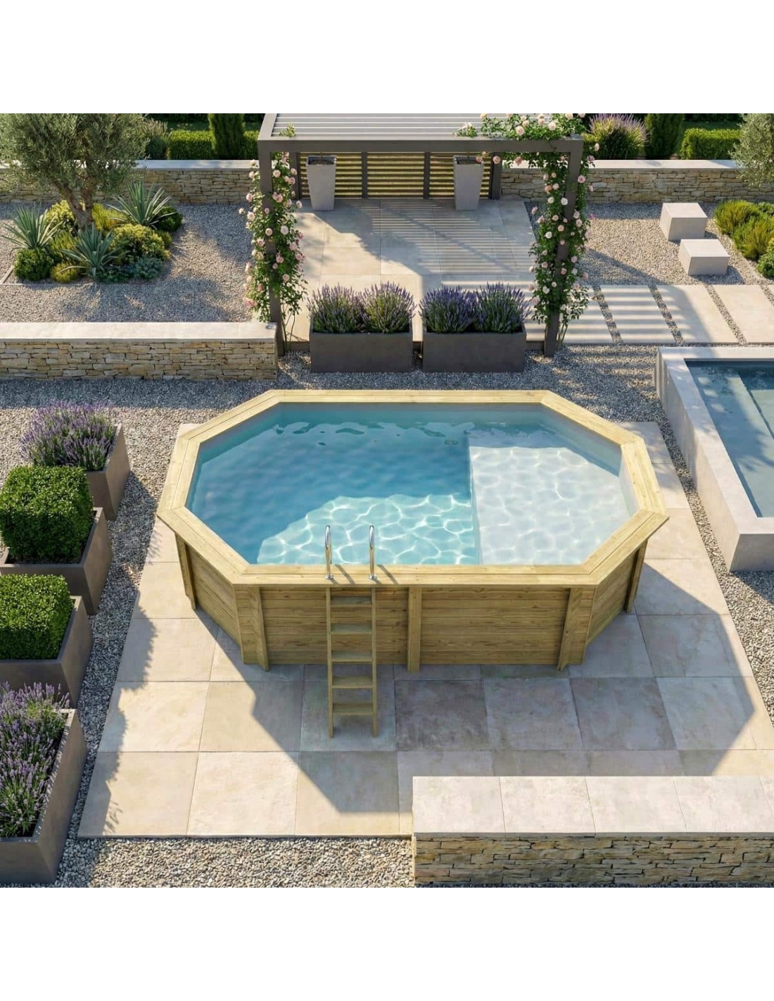 Holz verleiht der Umgebung einen eleganten und gemütlichen Charakter, und sein klassisches Erscheinungsbild sorgt dafür, dass sich der Pool harmonisch in jede Gartenart einfügt. Sie können Holzterrassen, Pflanzen oder dekorative Beleuchtung ergänzen, um eine besonders stimmungsvolle Atmosphäre zu schaffen.