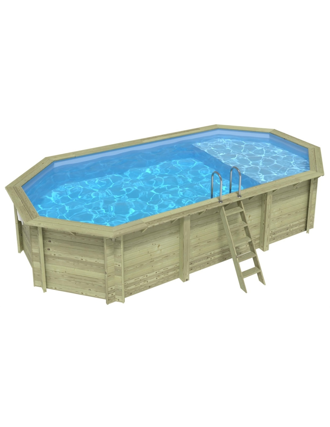 Entdecken Sie einen Pool, der die natürliche Schönheit von Holz, eine stabile Konstruktion und eine besondere flache Entspannungszone vereint.
