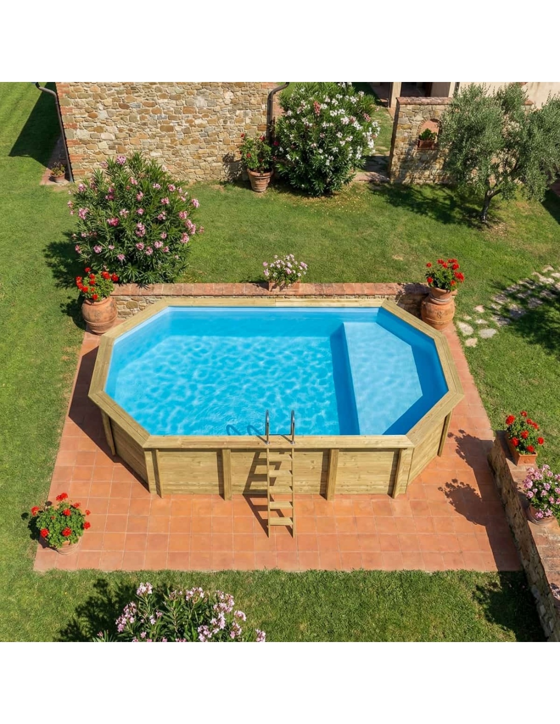 Holz verleiht der Umgebung einen eleganten und gemütlichen Charakter, und sein klassisches Erscheinungsbild sorgt dafür, dass sich der Pool harmonisch in jede Gartenart einfügt. Sie können Holzterrassen, Pflanzen oder dekorative Beleuchtung ergänzen, um eine besonders stimmungsvolle Atmosphäre zu schaffen.