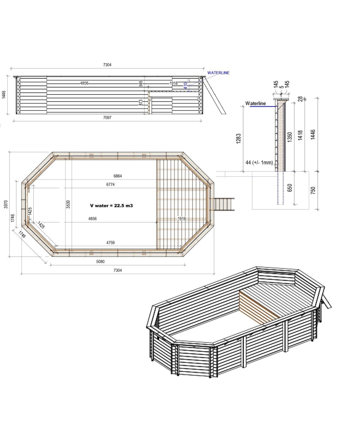 Das Poolmodell mit den Abmessungen 7.3 × 3.97 m und einer Höhe von 1.45 m bietet zwei Tiefenstufen – entwickelt für alle, die mehr als einen gewöhnlichen Gartenpool erwarten.