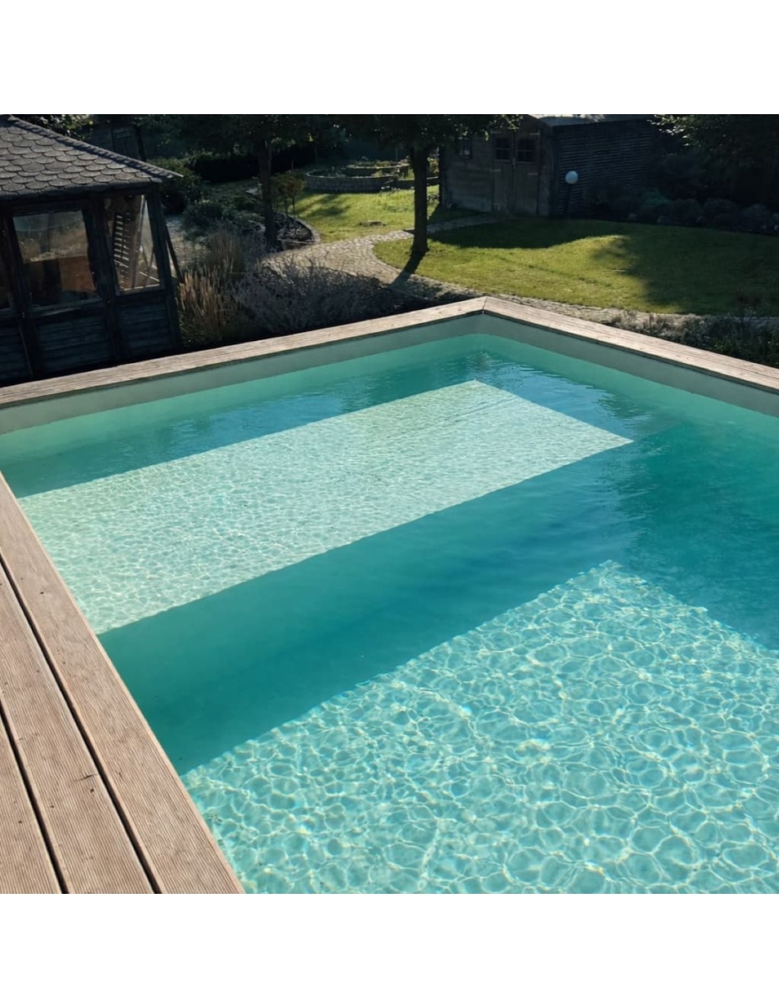 Entdecken Sie einen Pool, der die natürliche Schönheit von Holz, eine stabile Konstruktion und eine besondere flache Entspannungszone vereint.
