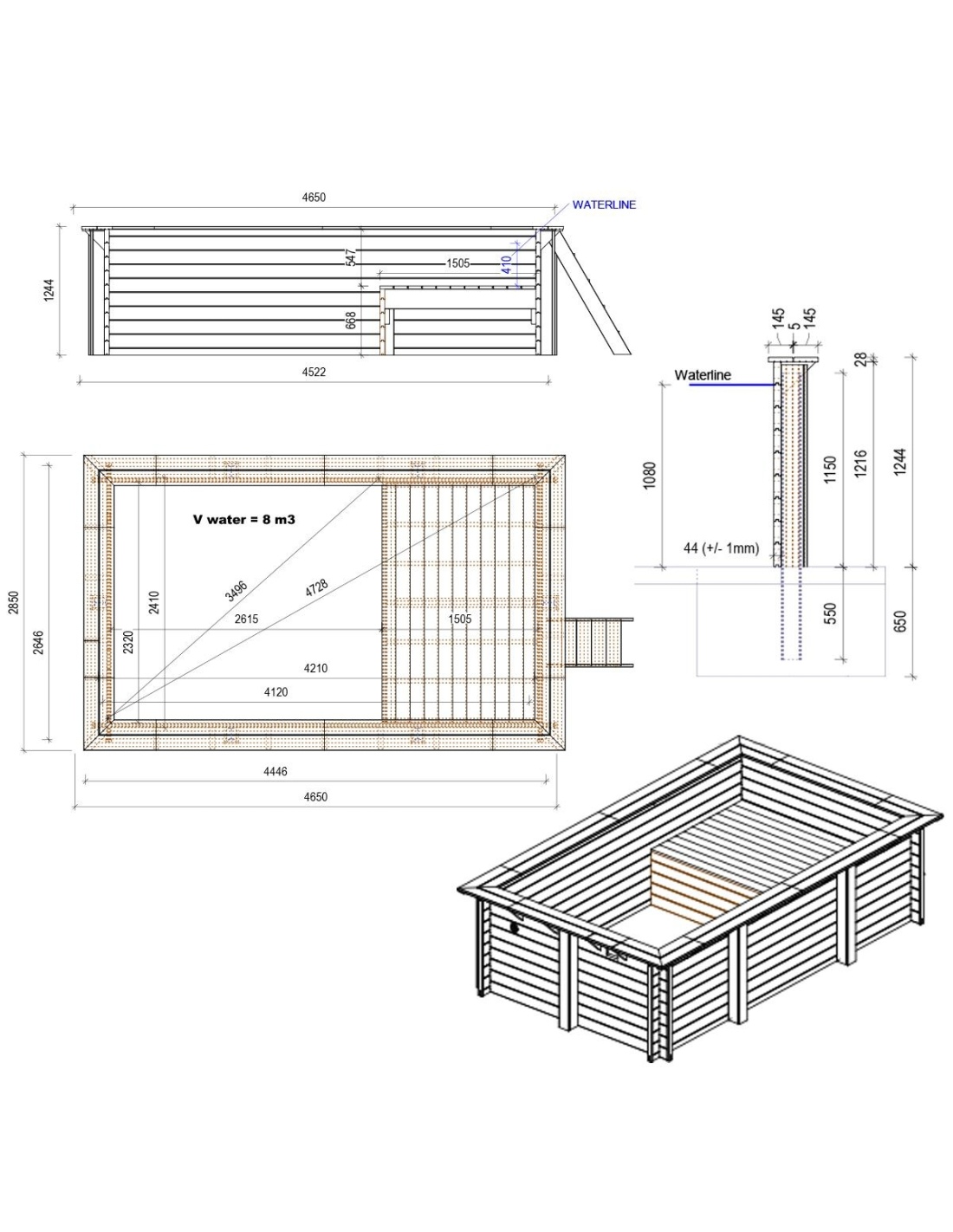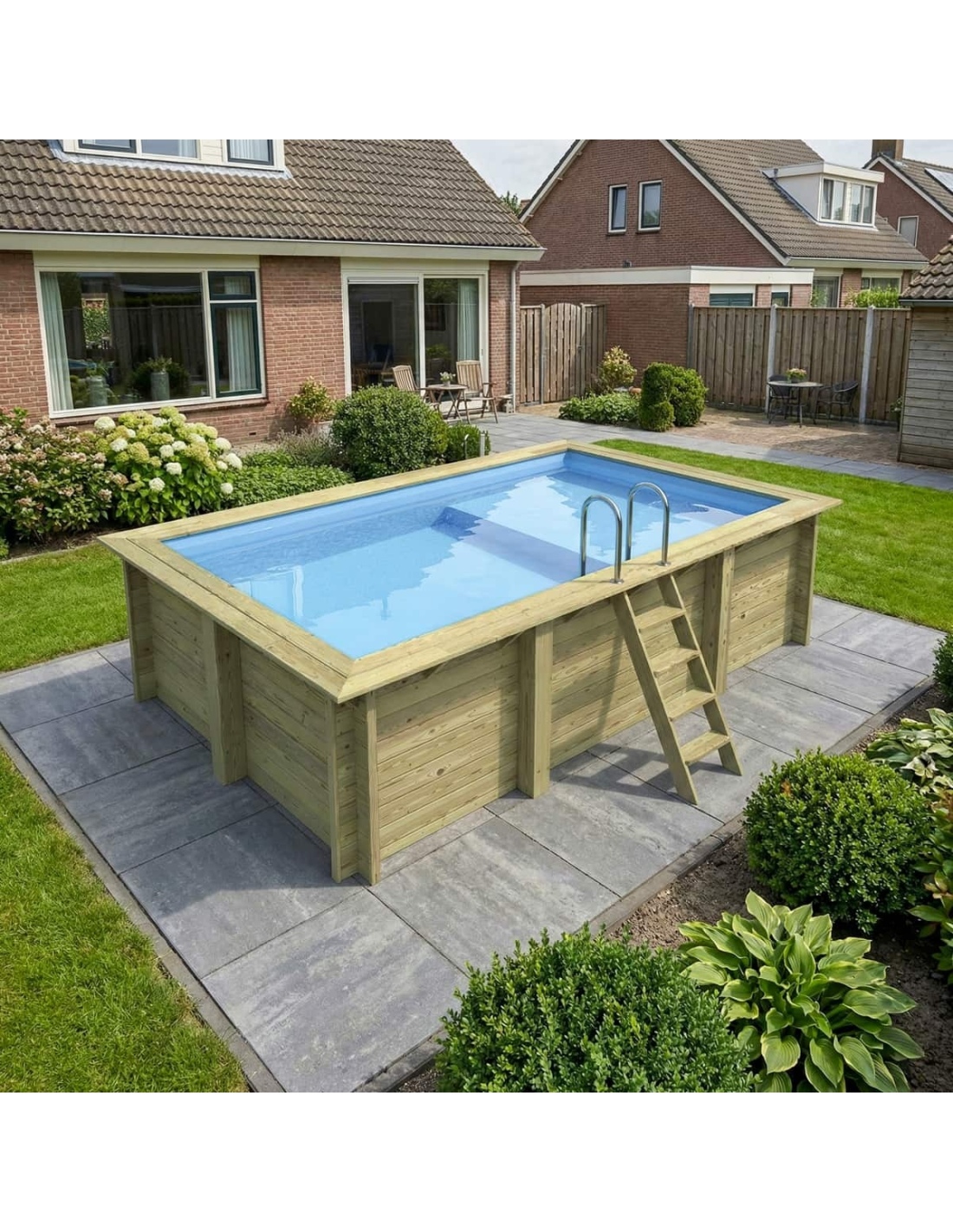 Der Pool besteht aus imprägniertem Kiefernholz, das nicht nur optisch überzeugt, sondern dank des Imprägnierungsprozesses: