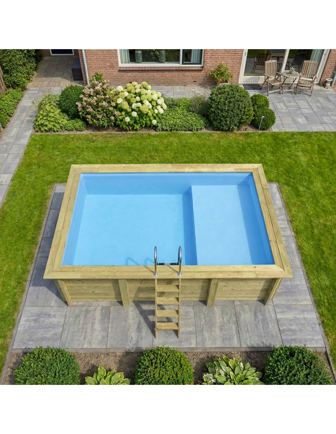 Entdecken Sie einen Pool, der die natürliche Schönheit von Holz, eine stabile Konstruktion und eine besondere flache Entspannungszone vereint.