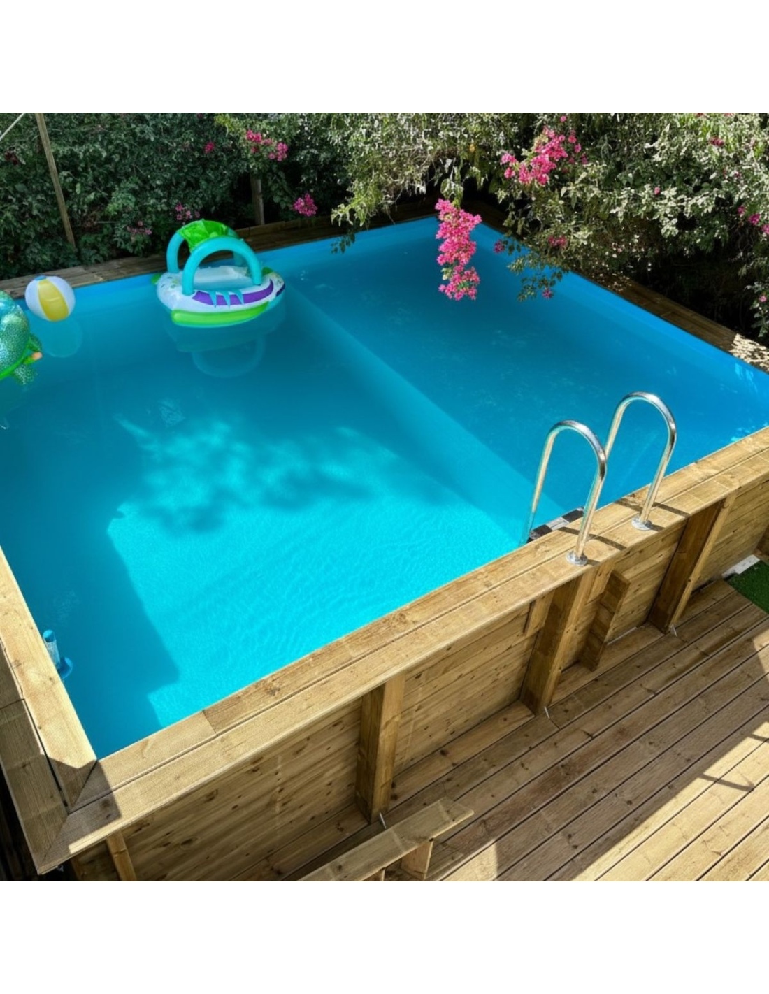 Der Pool besteht aus imprägniertem Kiefernholz, das nicht nur optisch überzeugt, sondern dank des Imprägnierungsprozesses: