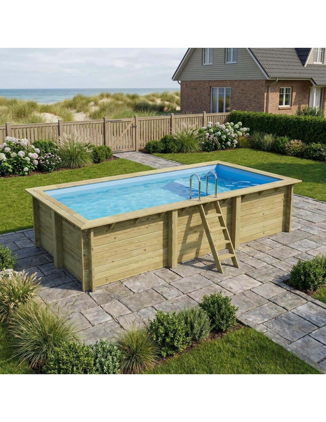 Der Pool besteht aus imprägniertem Kiefernholz, das nicht nur optisch überzeugt, sondern dank des Imprägnierungsprozesses: