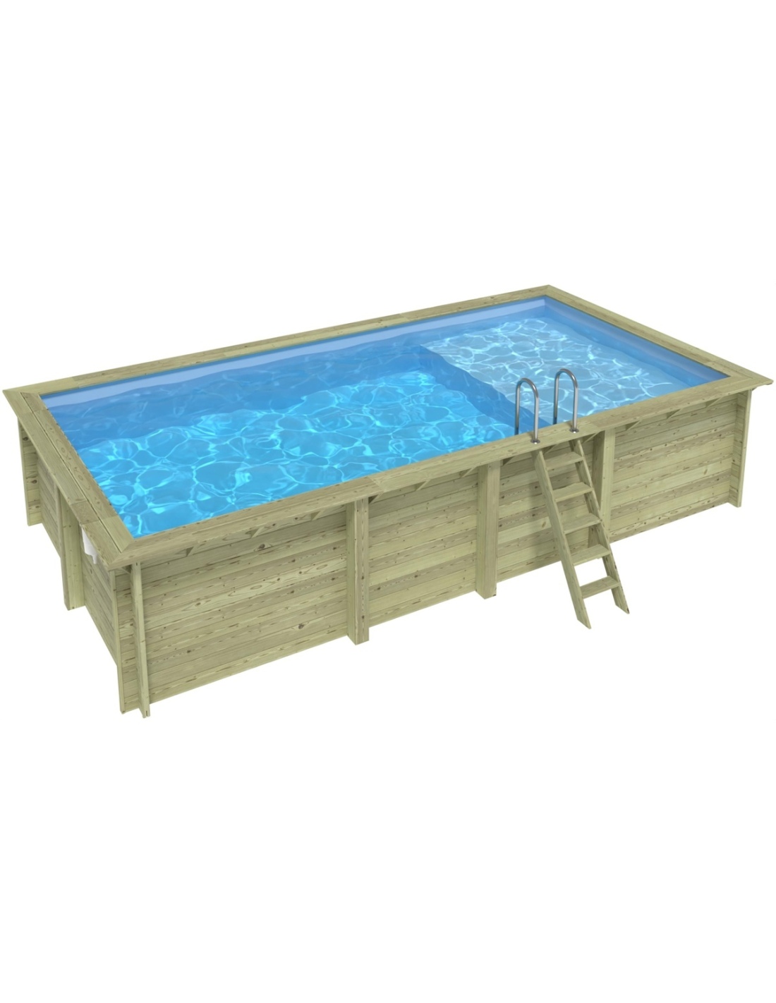Entdecken Sie einen Pool, der die natürliche Schönheit von Holz, eine stabile Konstruktion und eine besondere flache Entspannungszone vereint.