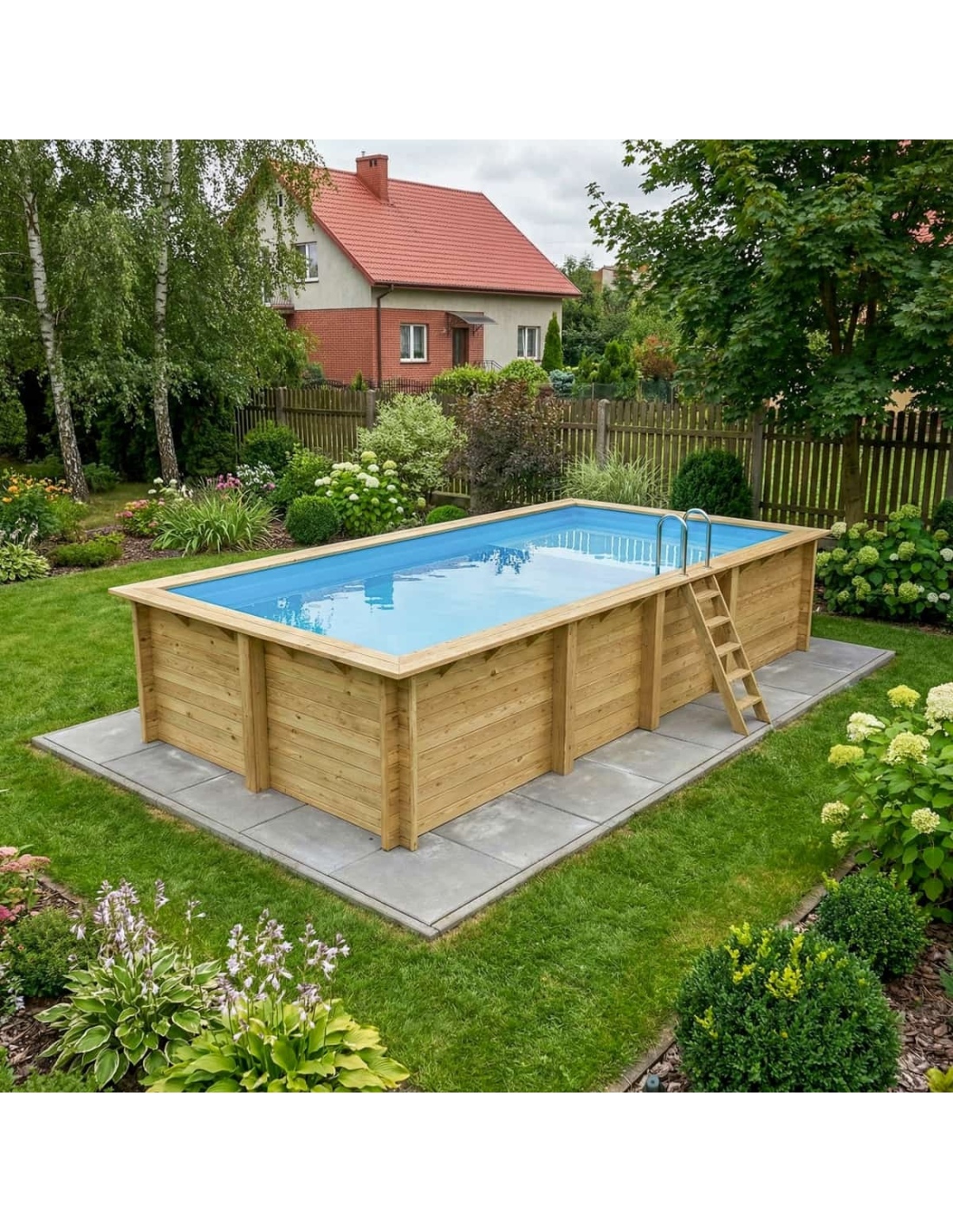 Holz verleiht der Umgebung einen eleganten und gemütlichen Charakter, und sein klassisches Erscheinungsbild sorgt dafür, dass sich der Pool harmonisch in jede Gartenart einfügt. Sie können Holzterrassen, Pflanzen oder dekorative Beleuchtung ergänzen, um eine besonders stimmungsvolle Atmosphäre zu schaffen.