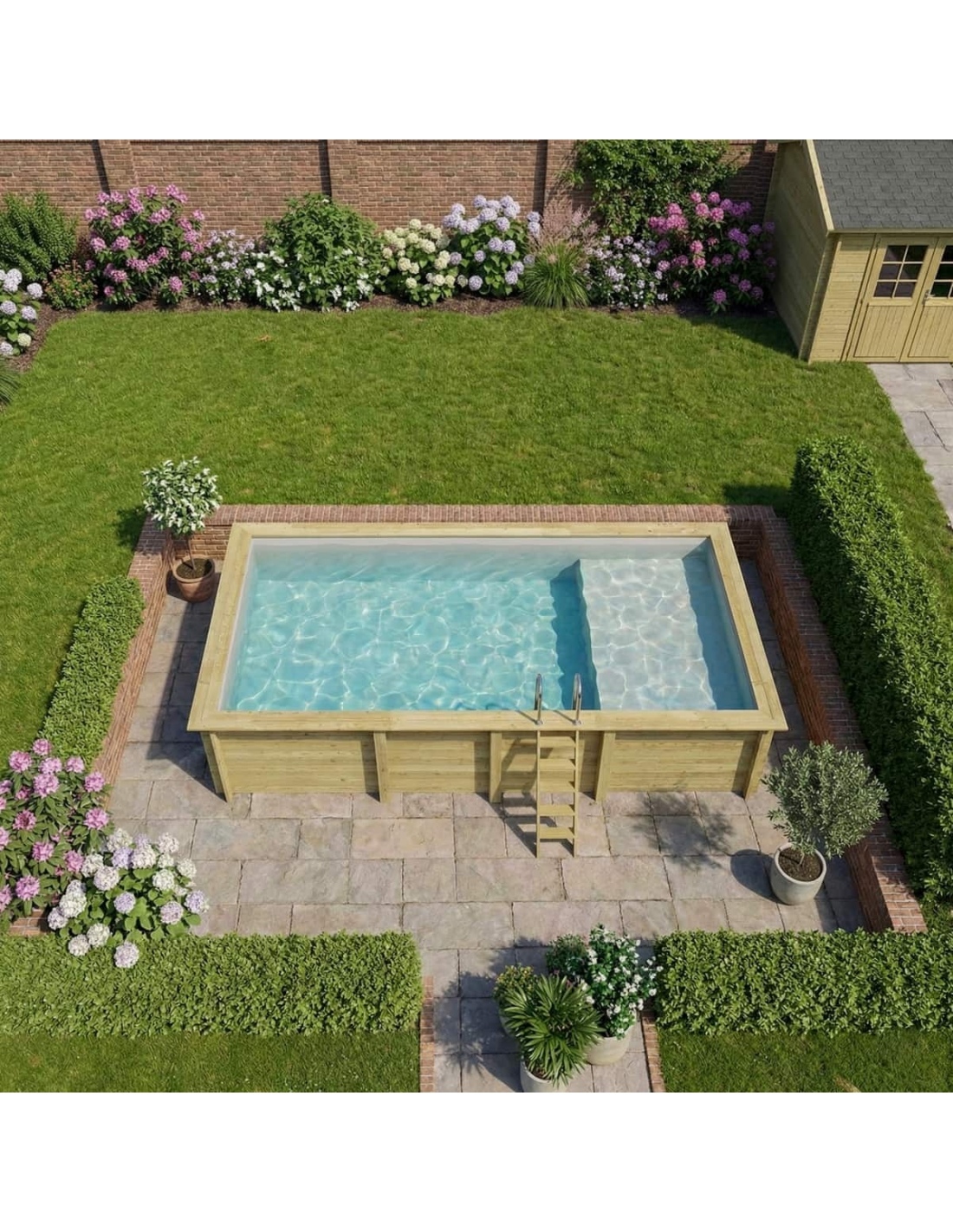 Entdecken Sie einen Pool, der die natürliche Schönheit von Holz, eine stabile Konstruktion und eine besondere flache Entspannungszone vereint.