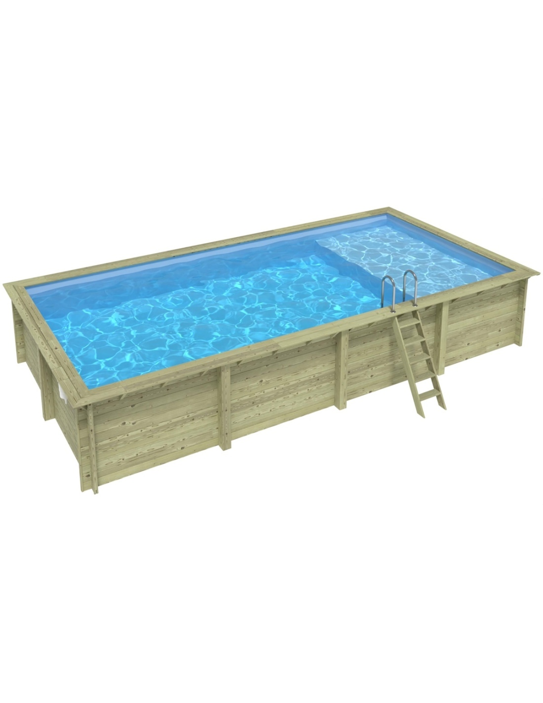 Entdecken Sie einen Pool, der die natürliche Schönheit von Holz, eine stabile Konstruktion und eine besondere flache Entspannungszone vereint.