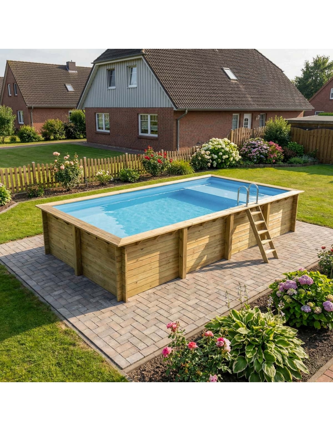 Holz verleiht der Umgebung einen eleganten und gemütlichen Charakter, und sein klassisches Erscheinungsbild sorgt dafür, dass sich der Pool harmonisch in jede Gartenart einfügt. Sie können Holzterrassen, Pflanzen oder dekorative Beleuchtung ergänzen, um eine besonders stimmungsvolle Atmosphäre zu schaffen.