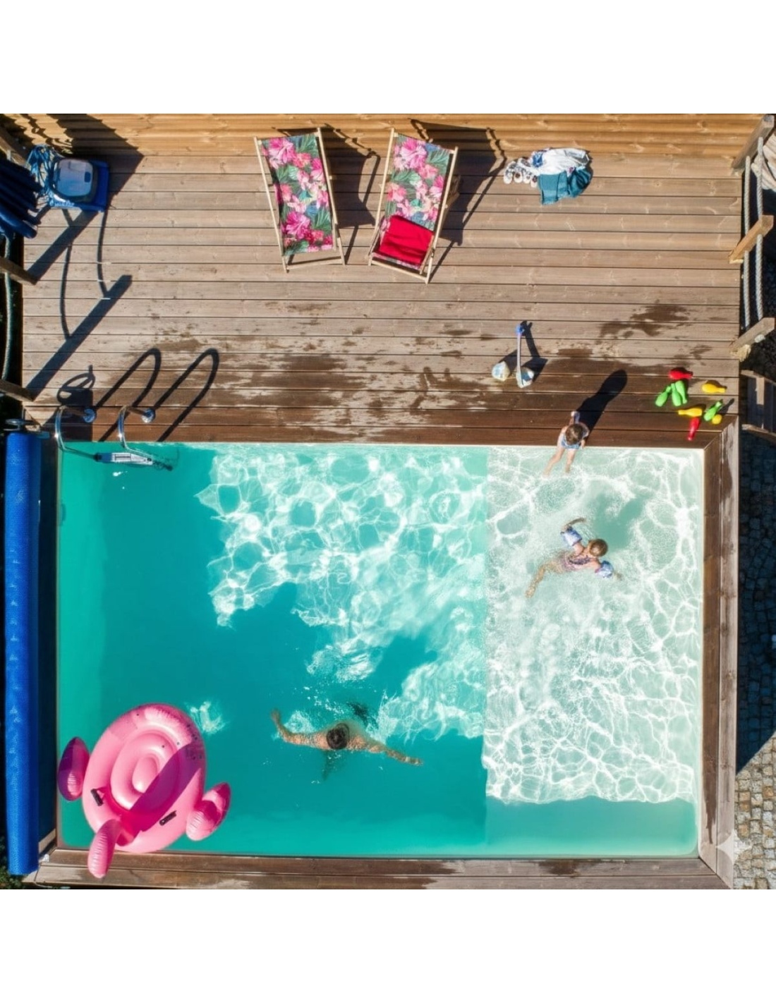 Entdecken Sie einen Pool, der die natürliche Schönheit von Holz, eine stabile Konstruktion und eine besondere flache Entspannungszone vereint.