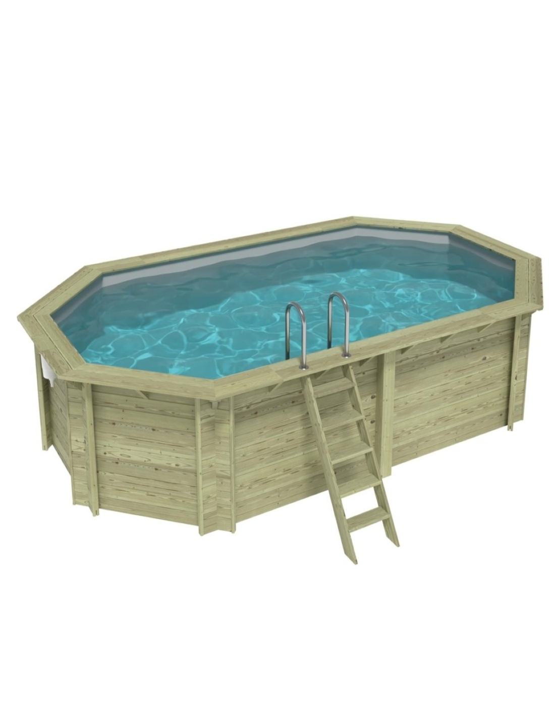 Der Pool besteht aus imprägniertem Kiefernholz, das nicht nur optisch überzeugt, sondern dank des Imprägnierungsprozesses: