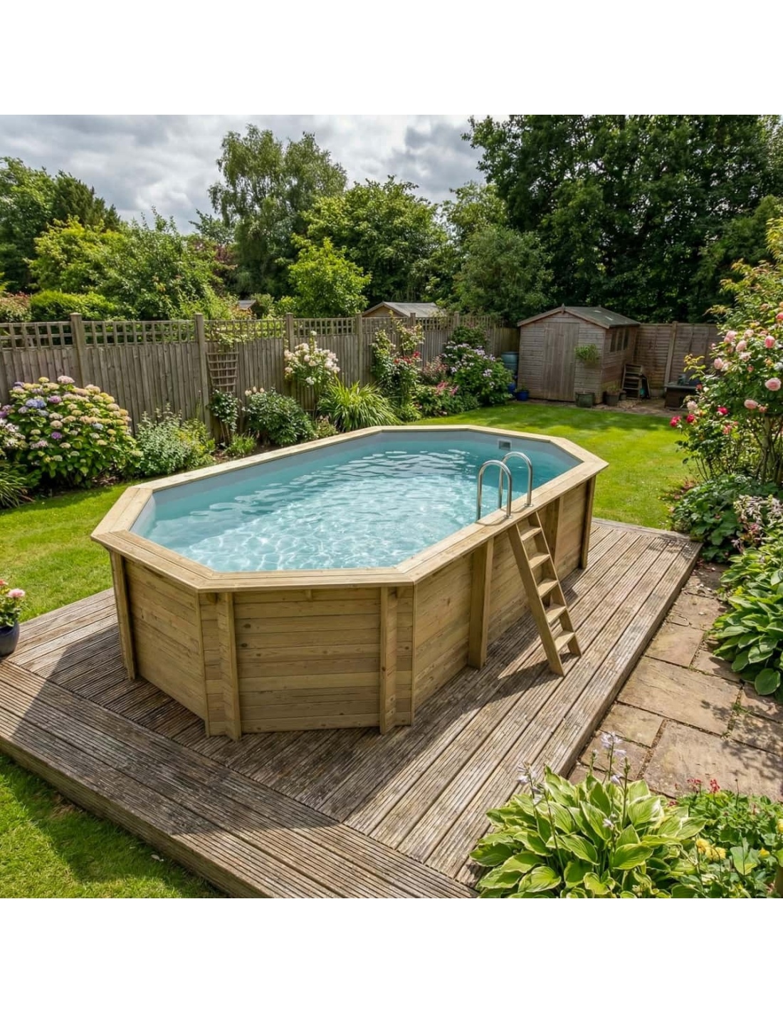 Holz verleiht der Umgebung einen eleganten und gemütlichen Charakter, und sein klassisches Erscheinungsbild sorgt dafür, dass sich der Pool harmonisch in jede Gartenart einfügt. Sie können Holzterrassen, Pflanzen oder dekorative Beleuchtung ergänzen, um eine besonders stimmungsvolle Atmosphäre zu schaffen.