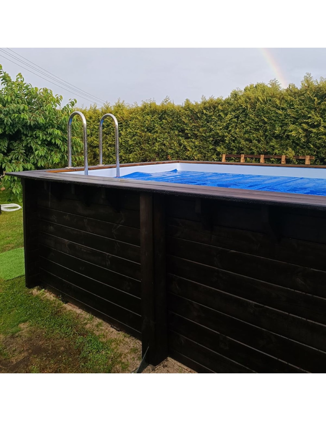 Der Pool besteht aus imprägniertem Kiefernholz, das nicht nur optisch überzeugt, sondern dank des Imprägnierungsprozesses: