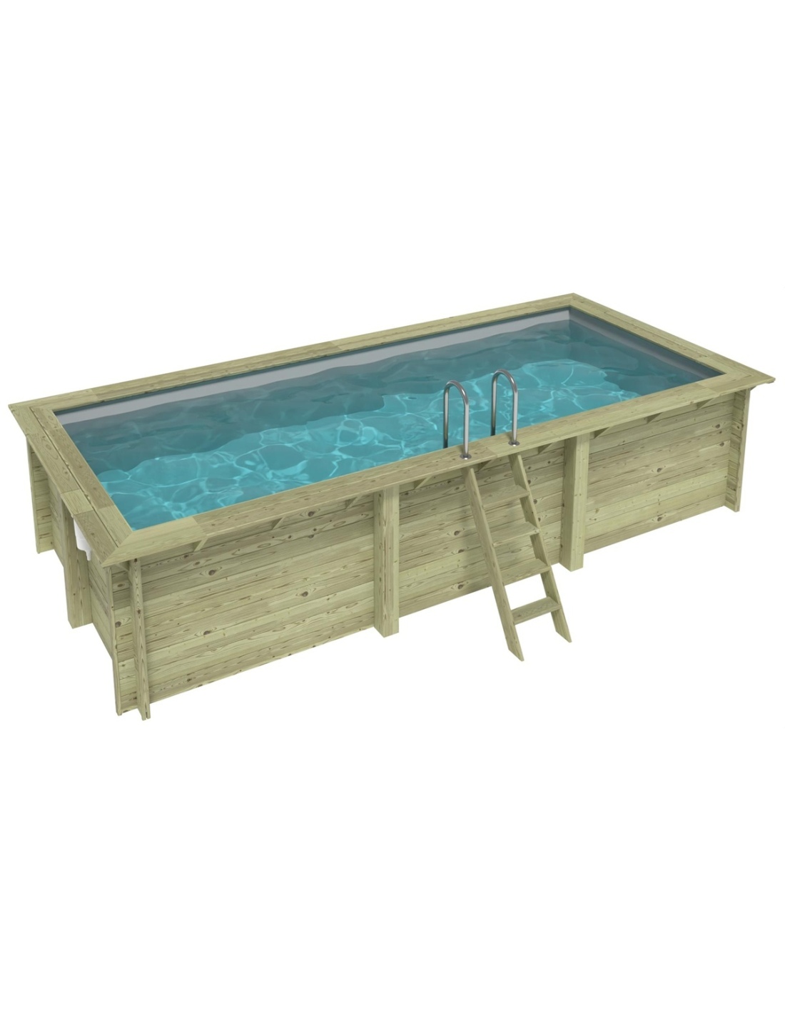 Der Pool besteht aus imprägniertem Kiefernholz, das nicht nur optisch überzeugt, sondern dank des Imprägnierungsprozesses: